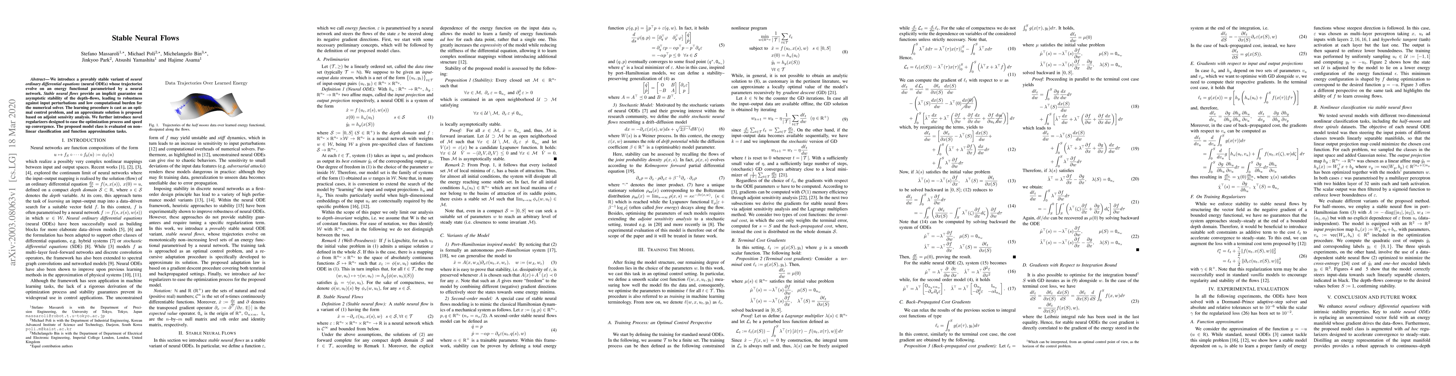 This paper introduces stable neural flows, a stable variant of neural ordinary differential equations, which ensures robustness and low computational cost through an energy functional. The learning process is framed as an optimal control problem, employing adjoint sensitivity analysis and novel regularizers to enhance optimization and convergence.