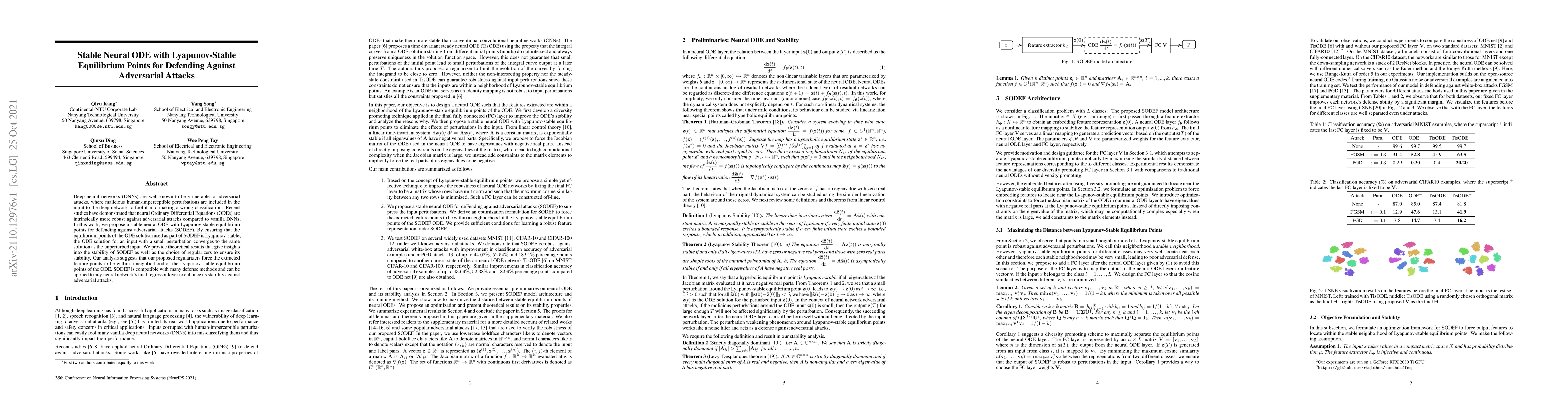 This paper proposes a stable neural ODE (SODEF) with Lyapunov-stable equilibrium points to defend against adversarial attacks, ensuring that perturbed inputs converge to the same solution as unperturbed inputs. Theoretical analysis provides insights into SODEF's stability and effective regularizers, enhancing neural network robustness.