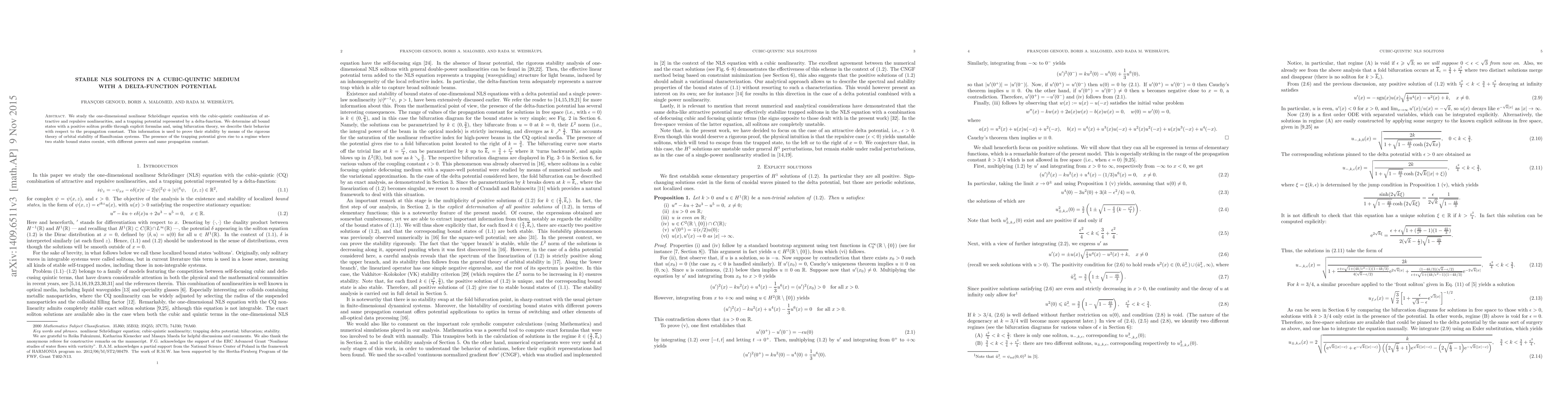 We study the one-dimensional nonlinear Schr\"odinger equation with the cubic-quintic combination of attractive and repulsive nonlinearities, and a trapping potential represented by a delta-function. We determine all bound states with a positive soliton profile through explicit formulas and, using bifurcation theory, we describe their behavior with respect to the propagation constant. This information is used to prove their stability by means of the rigorous theory of orbital stability of Hamiltonian systems. The presence of the trapping potential gives rise to a regime where two stable bound states coexist, with different powers and same propagation constant.