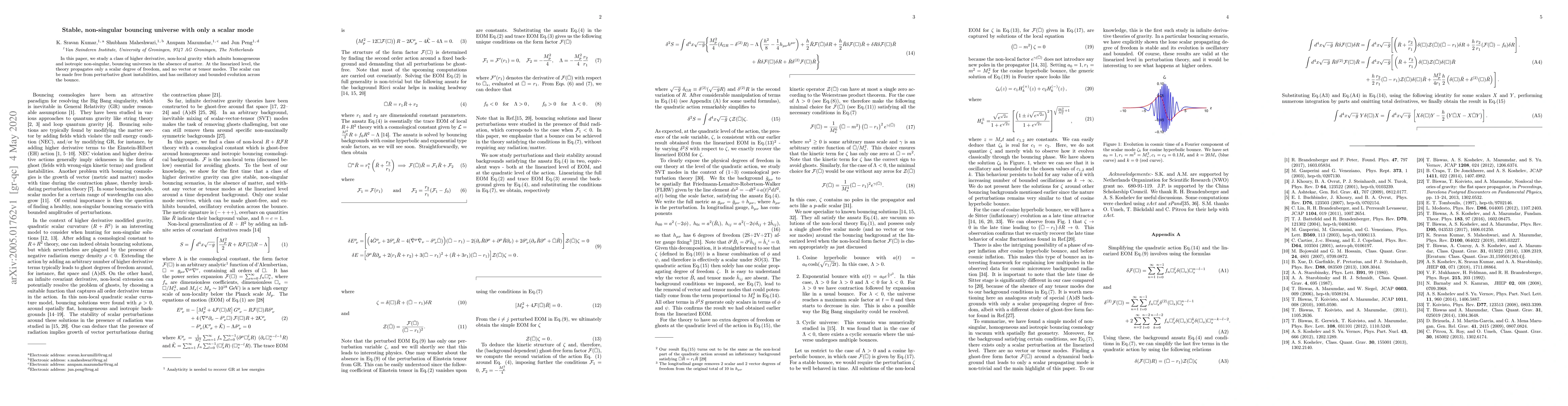 In this paper, we study a class of higher derivative, non-local gravity which admits homogeneous and isotropic non-singular, bouncing universes in the absence of matter. At the linearized level, the theory propagates only a scalar degree of freedom, and no vector or tensor modes. The scalar can be made free from perturbative ghost instabilities, and has oscillatory and bounded evolution across the bounce.
