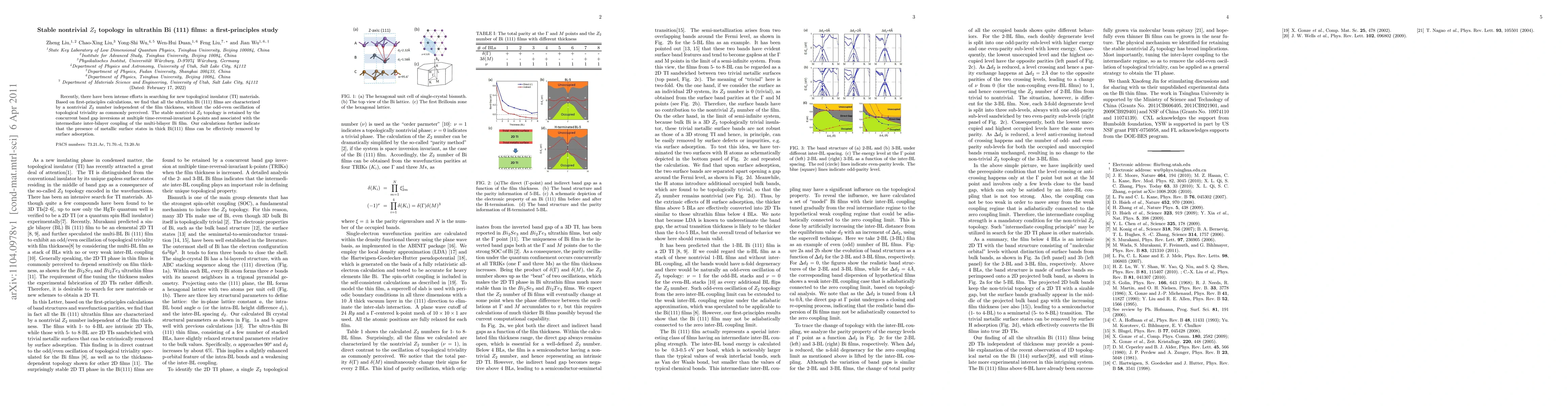 This study reveals that ultrathin Bi (111) films maintain a stable nontrivial Z2 topological phase regardless of thickness, due to band gap inversions at multiple k-points, and can have metallic surface states mitigated by surface adsorption. First-principles calculations underpin these findings.