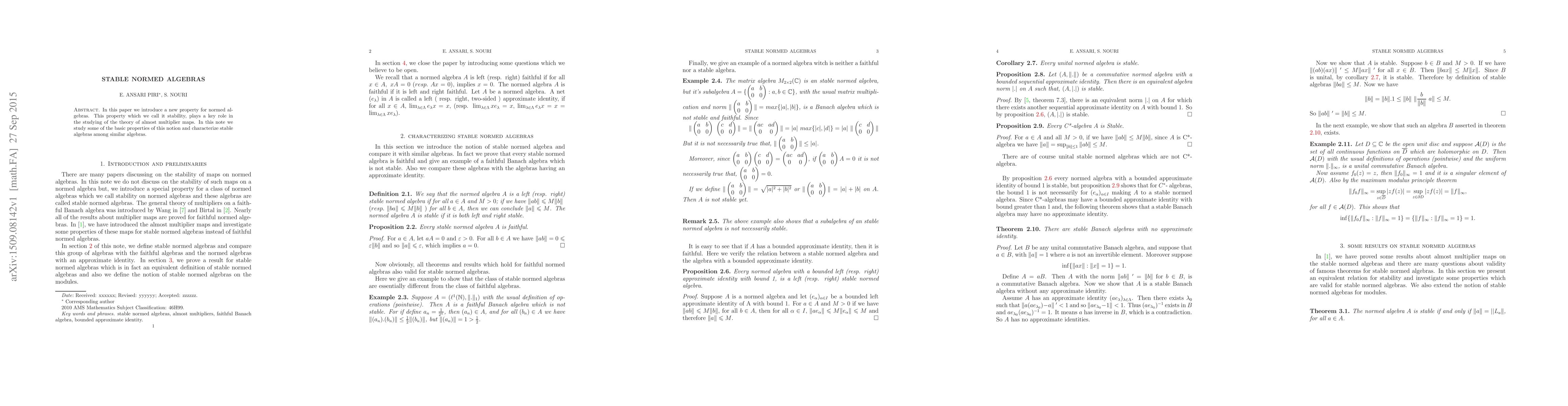 In this paper we introduce a new property for normed algebras. This property which we call it stability, plays a key role in the studying of the theory of almost multiplier maps. In this note we study some of the basic properties of this notion and characterize stable algebras among similar algebras.