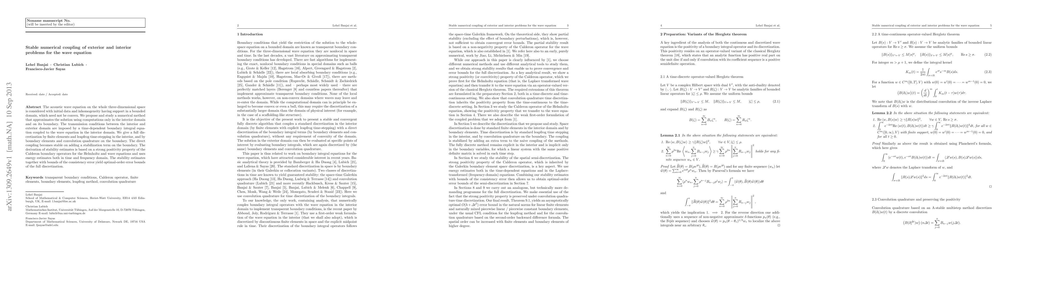 This paper presents a method for numerically coupling exterior and interior wave equation problems in a stable manner, ensuring accurate solution convergence across different regions. The proposed approach enhances computational efficiency and precision in complex wave propagation simulations.