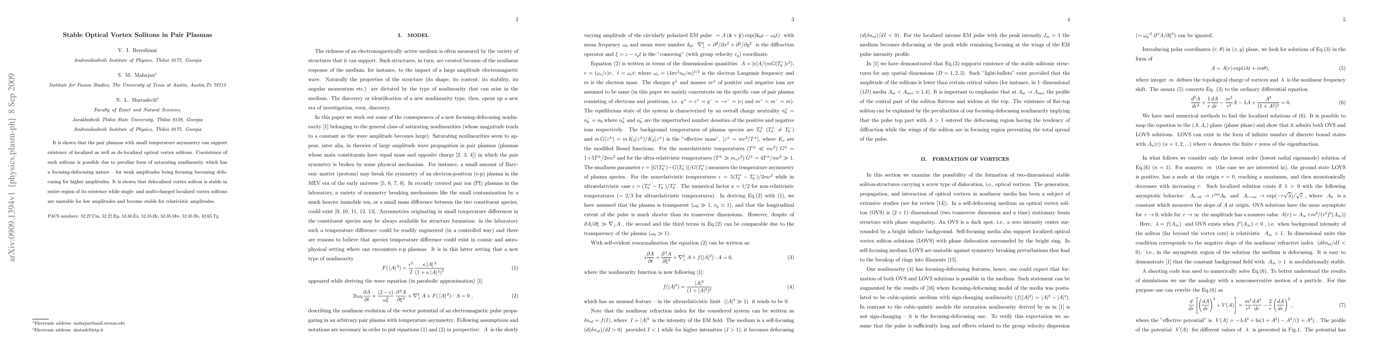 This paper demonstrates that pair plasmas with slight temperature asymmetry can sustain both localized and delocalized optical vortex solitons, enabled by a unique saturating nonlinearity that shifts from focusing to defocusing with increasing amplitude. Delocalized vortex solitons remain stable throughout their existence, while localized solitons transition from instability to stability at relativistic amplitudes.