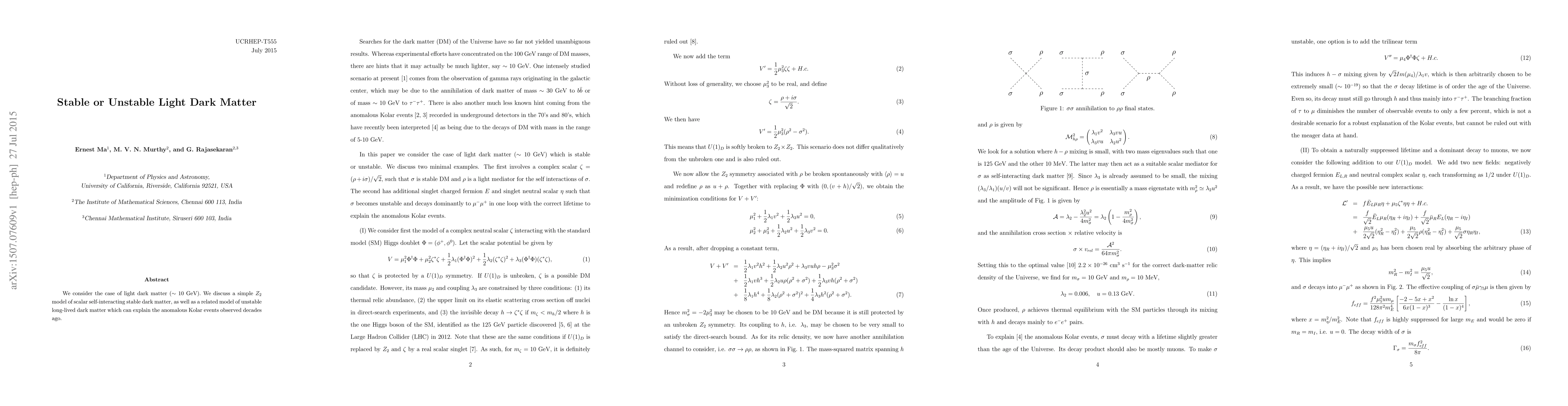 We consider the case of light dark matter ($\sim 10$ GeV). We discuss a simple $Z_2$ model of scalar self-interacting dark matter, as well as a related model of unstable long-lived dark matter which can explain the anomalous Kolar events observed decades ago.