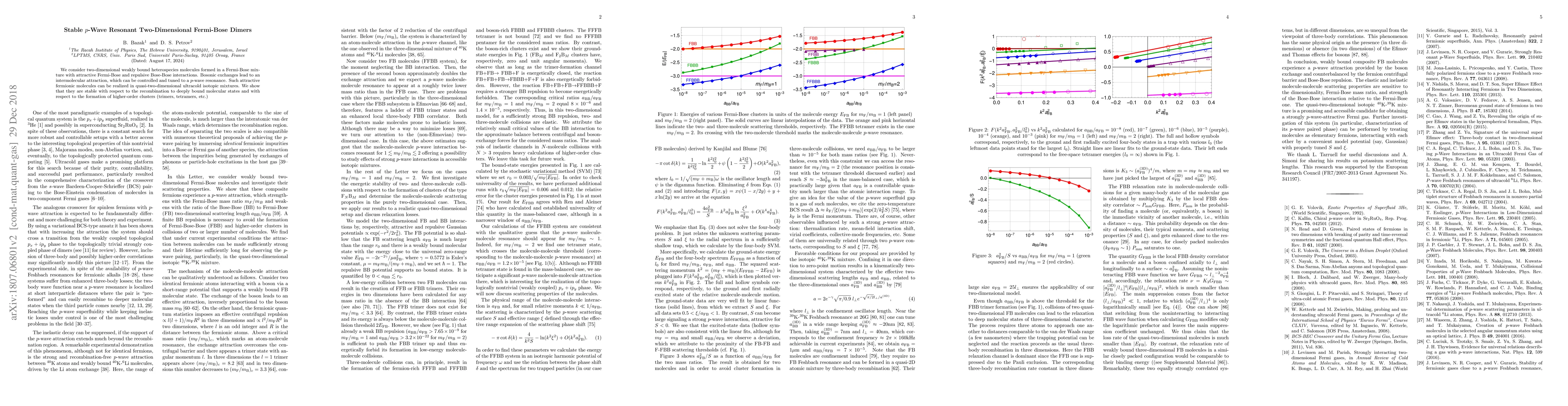 This paper investigates stable p-wave resonant two-dimensional Fermi-Bose dimers in a mixture with controlled attractive Fermi-Bose and repulsive Bose-Bose interactions, demonstrating their stability against recombination and higher-order clustering. Such dimers can be realized in ultracold isotopic or heteronuclear mixtures.