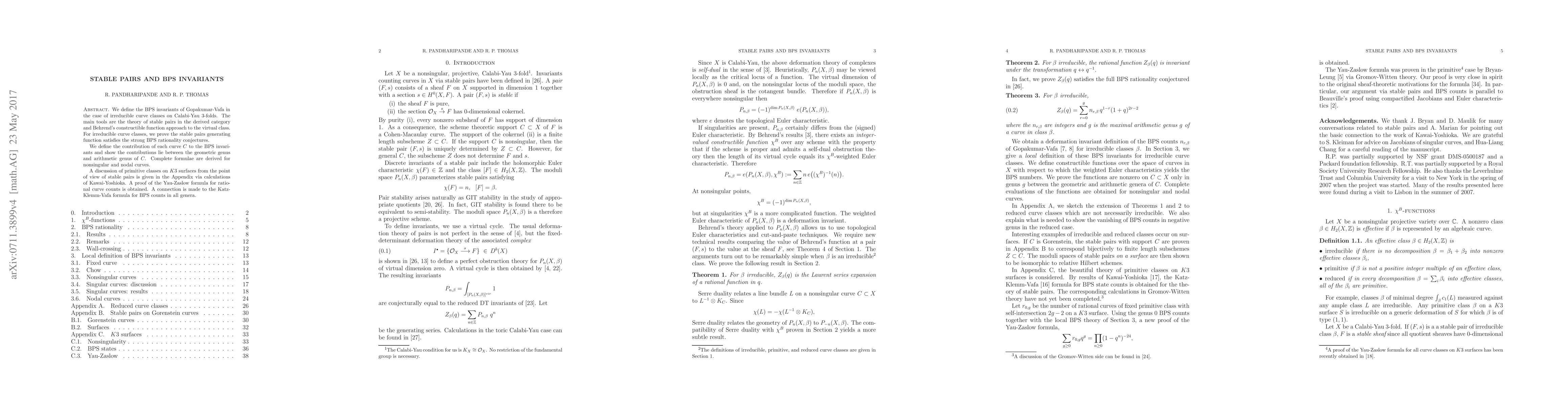 The paper defines BPS invariants for irreducible curve classes on Calabi-Yau 3-folds using stable pairs and Behrend functions, proving rationality conjectures. It provides complete formulae for contributions from nonsingular and nodal curves, and discusses primitive classes on K3 surfaces and the Yau-Zaslow formula.