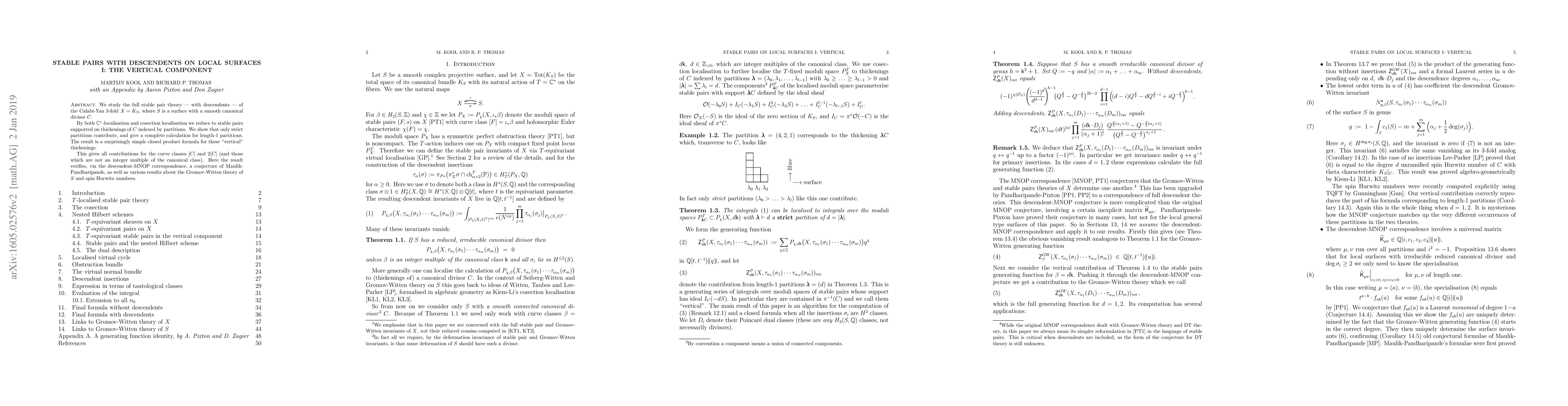 We study the full stable pair theory --- with descendents --- of the Calabi-Yau 3-fold $X=K_S$, where $S$ is a surface with a smooth canonical divisor $C$. By both $\mathbb C^*$-localisation and cosection localisation we reduce to stable pairs supported on thickenings of $C$ indexed by partitions. We show that only strict partitions contribute, and give a complete calculation for length-1 partitions. The result is a surprisingly simple closed product formula for these "vertical" thickenings. This gives all contributions for the curve classes $[C]$ and $2[C]$ (and those which are not an integer multiple of the canonical class). Here the result verifies, via the descendent-MNOP correspondence, a conjecture of Maulik-Pandharipande, as well as various results about the Gromov-Witten theory of $S$ and spin Hurwitz numbers.