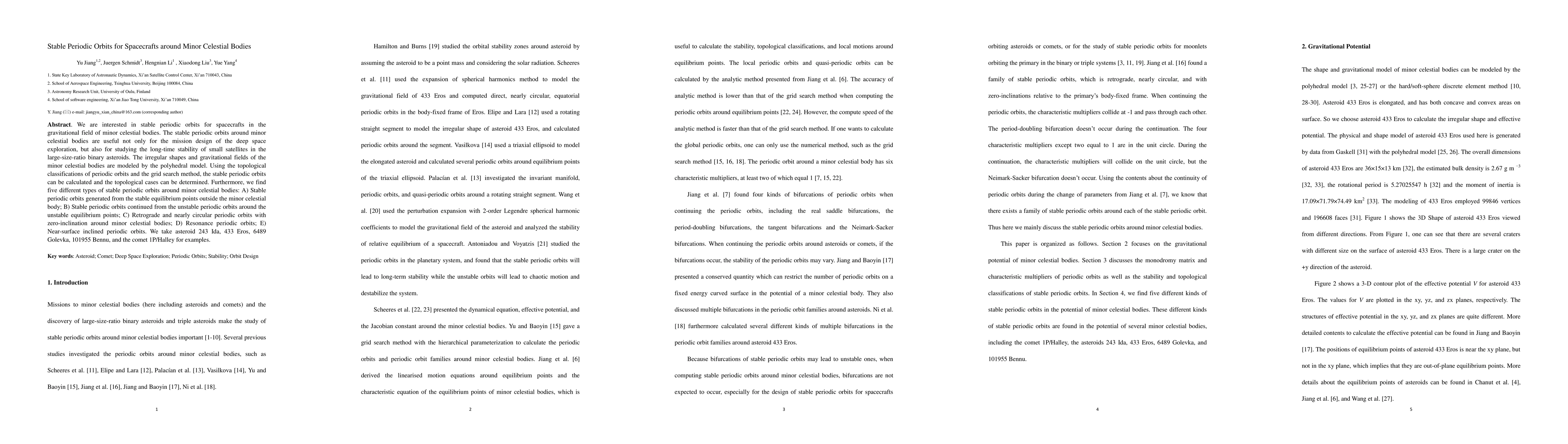 This paper identifies and classifies stable periodic orbits for spacecraft around minor celestial bodies, using polyhedral models to account for their irregular shapes. It discovers five types of stable orbits, providing valuable insights for deep space mission design and stability studies of small satellites in binary asteroids.