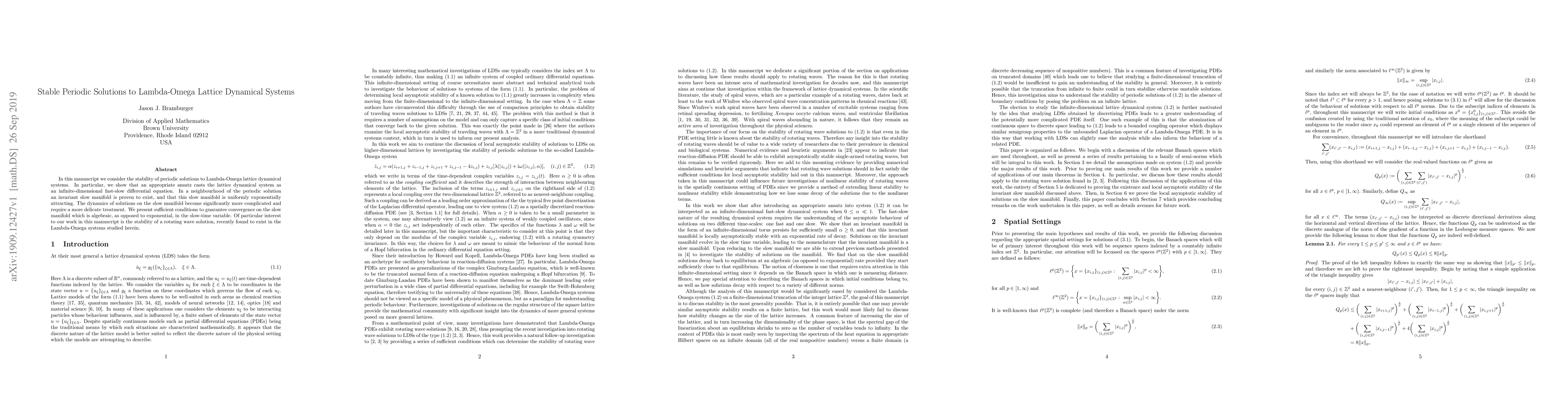 In this manuscript we consider the stability of periodic solutions to Lambda-Omega lattice dynamical systems. In particular, we show that an appropriate ansatz casts the lattice dynamical system as an infinite-dimensional fast-slow differential equation. In a neighbourhood of the periodic solution an invariant slow manifold is proven to exist, and that this slow manifold is uniformly exponentially attracting. The dynamics of solutions on the slow manifold become significantly more complicated and require a more delicate treatment. We present sufficient conditions to guarantee convergence on the slow manifold which is algebraic, as opposed to exponential, in the slow-time variable. Of particular interest to our work in this manuscript is the stability of a rotating wave solution, recently found to exist in the Lambda-Omega systems studied herein.