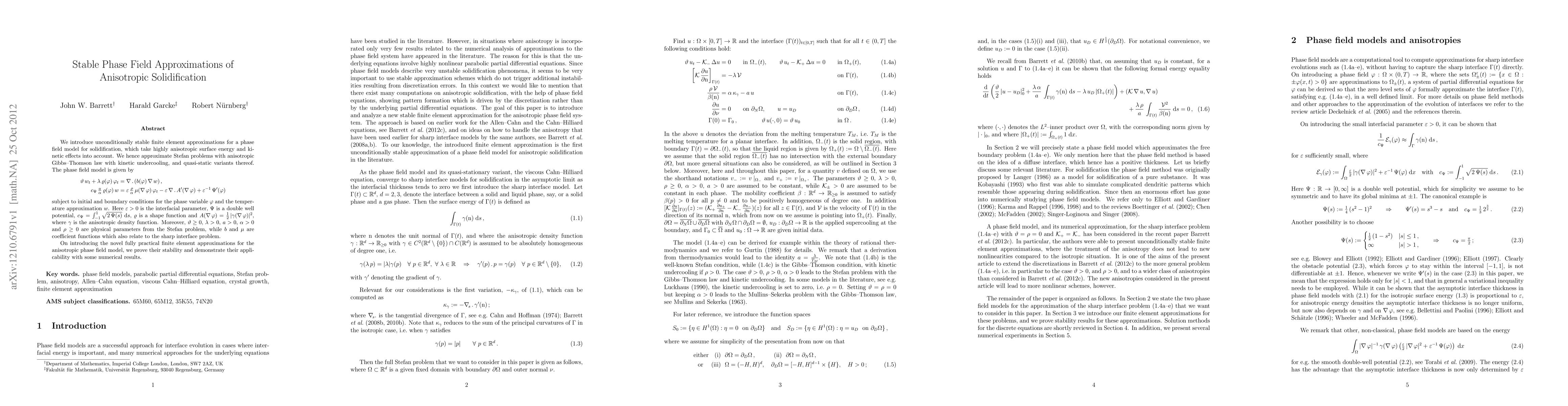 This paper introduces unconditionally stable finite element approximations for a phase field model that accounts for anisotropic surface energy and kinetic effects in solidification processes. The authors prove the stability of their novel method and demonstrate its effectiveness through numerical results.