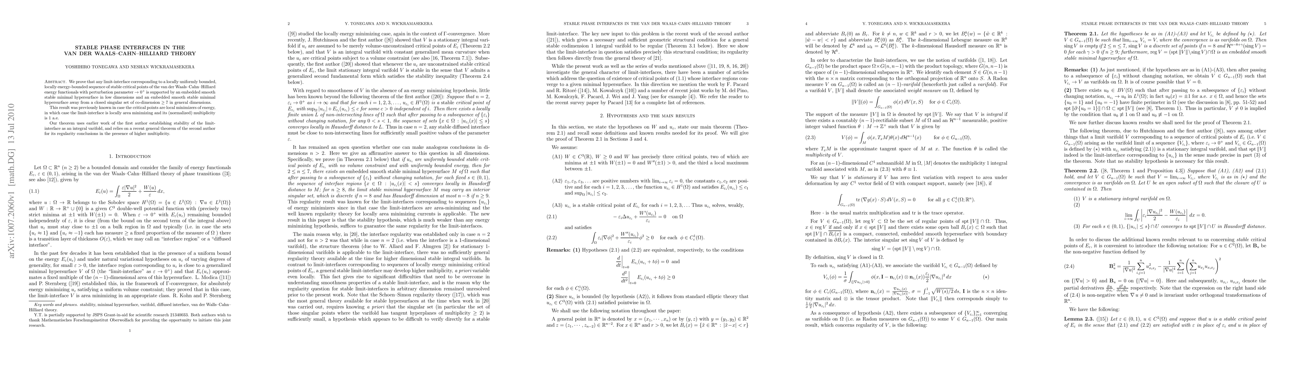 We prove that any limit-interface corresponding to a locally uniformly bounded, locally energy-bounded sequence of stable critical points of the van der Waals--Cahn--Hilliard energy functionals with perturbation parameter tending to 0 is supported by an embedded smooth stable minimal hypersurface in low dimensions and an embedded smooth stable minimal hypersurface away from a closed singular set of co-dimension at least 7 in general dimensions. This result was previously known in case the critical points are local minimizers of energy, in which case the limit-hypersurface is locally area minimizing and its (normalized) multiplicity is 1 a.e. Our theorem uses earlier work of the first author establishing stability of the limit-interface as an integral varifold, and relies on a recent general theorem of the second author for its regularity conclusions in the presence of higher multiplicity.
