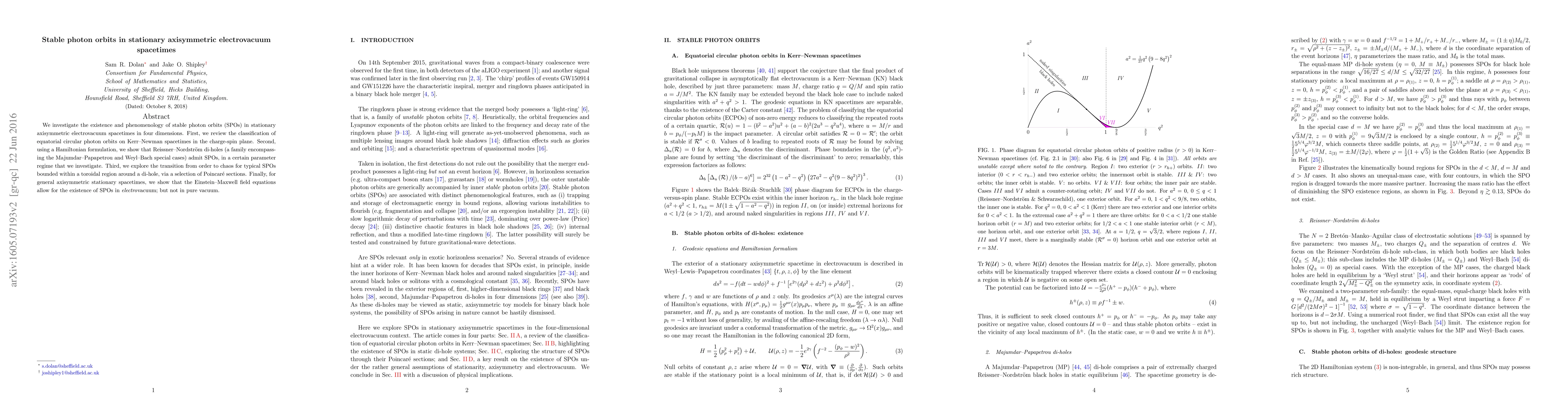 This paper explores stable photon orbits in stationary axisymmetric electrovacuum spacetimes, confirming their existence in Reissner-Nordström di-holes and examining transitions to chaos, while also showing that they do not exist in pure vacuum spacetimes.