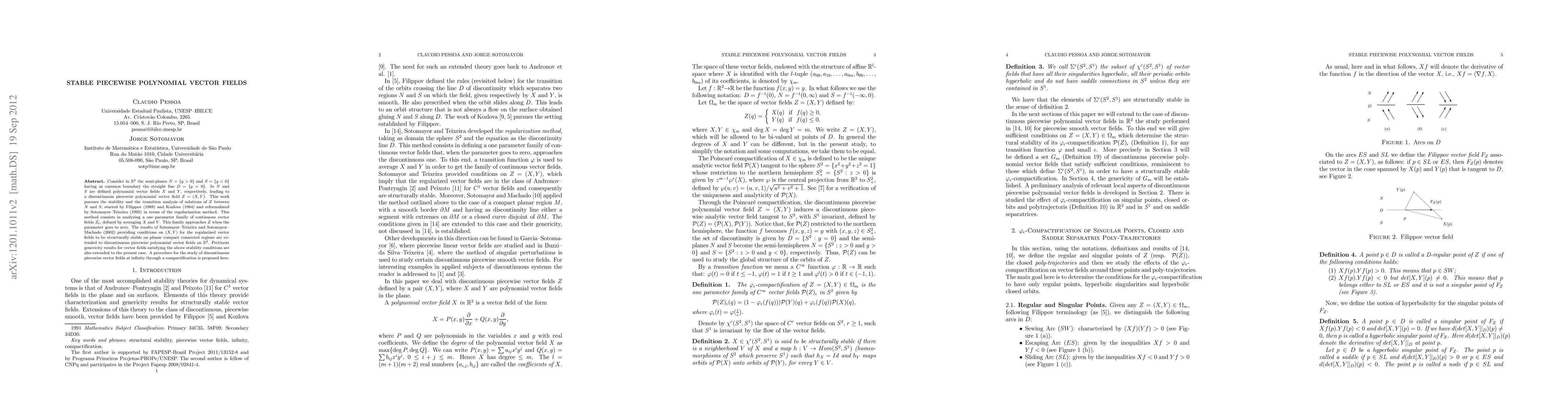This paper extends stability and transition analysis methods for piecewise polynomial vector fields in R^2, employing regularization techniques to ensure structural stability. It generalizes previous results and introduces a procedure for studying these fields at infinity using compactification.