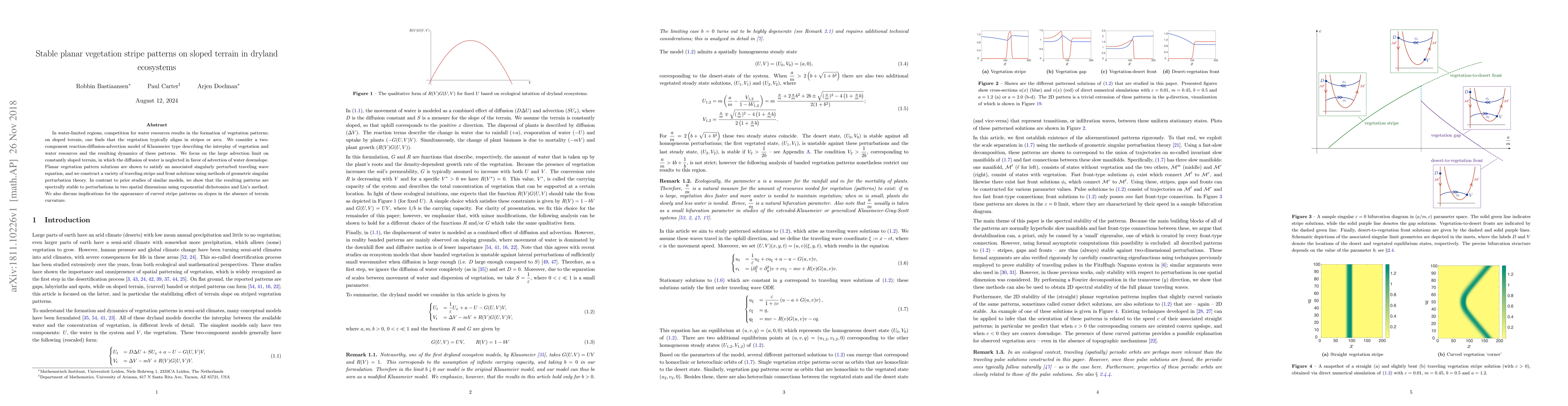 The novelty of this work lies in demonstrating the spectral stability of planar vegetation stripe patterns on sloped terrain in two spatial dimensions, contrasting with previous studies that did not consider this aspect, and in applying geometric singular perturbation theory to construct traveling wave solutions.