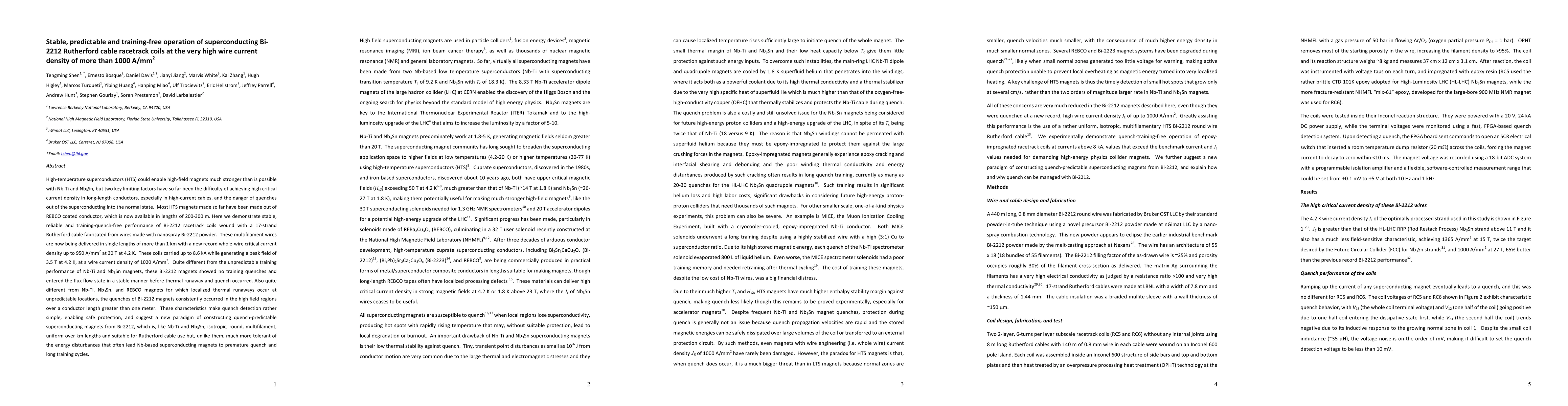 This paper demonstrates the stable operation of superconducting Bi-2212 Rutherford cable racetrack coils at unprecedented wire current densities exceeding 1000 A/mm², showing reliable performance without training-induced quenches and predictable quench locations, contrasting with Nb-Ti and Nb3Sn magnets.