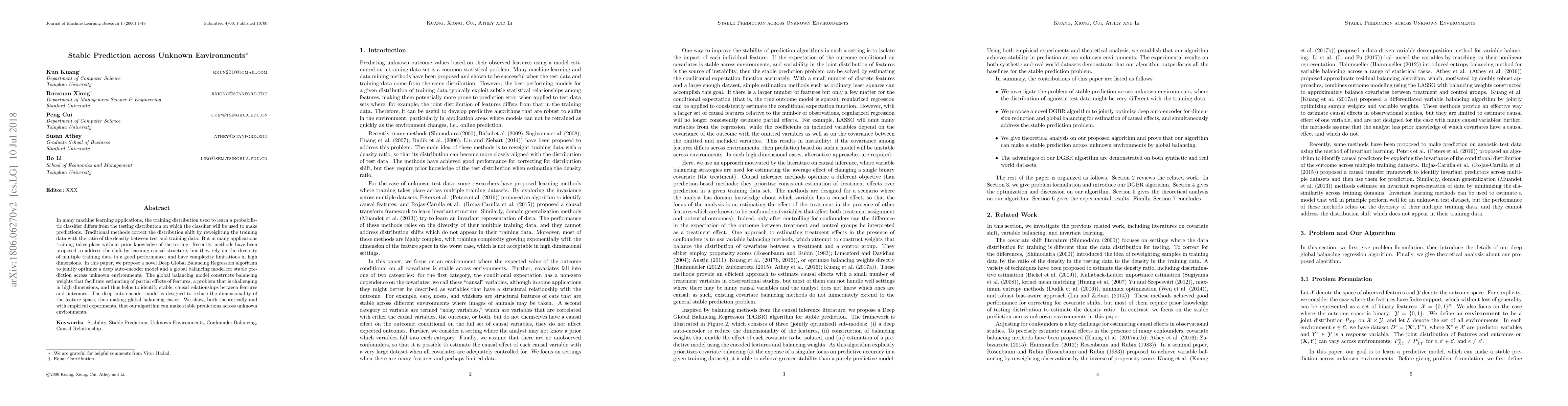 In many important machine learning applications, the training distribution used to learn a probabilistic classifier differs from the testing distribution on which the classifier will be used to make predictions. Traditional methods correct the distribution shift by reweighting the training data with the ratio of the density between test and training data. In many applications training takes place without prior knowledge of the testing distribution on which the algorithm will be applied in the future. Recently, methods have been proposed to address the shift by learning causal structure, but those methods rely on the diversity of multiple training data to a good performance, and have complexity limitations in high dimensions. In this paper, we propose a novel Deep Global Balancing Regression (DGBR) algorithm to jointly optimize a deep auto-encoder model for feature selection and a global balancing model for stable prediction across unknown environments. The global balancing model constructs balancing weights that facilitate estimating of partial effects of features (holding fixed all other features), a problem that is challenging in high dimensions, and thus helps to identify stable, causal relationships between features and outcomes. The deep auto-encoder model is designed to reduce the dimensionality of the feature space, thus making global balancing easier. We show, both theoretically and with empirical experiments, that our algorithm can make stable predictions across unknown environments. Our experiments on both synthetic and real world datasets demonstrate that our DGBR algorithm outperforms the state-of-the-art methods for stable prediction across unknown environments.