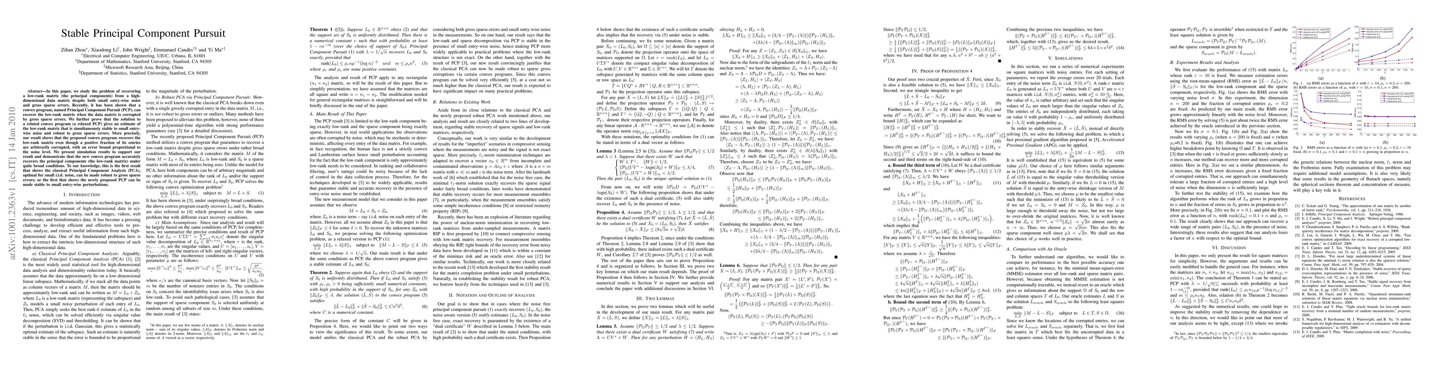 This paper proposes a convex program called Stable Principal Component Pursuit to recover a low-rank matrix from high-dimensional data, demonstrating stability to small entry-wise noise and robustness to gross sparse errors. Simulation results show accurate recovery of principal components under broad conditions.