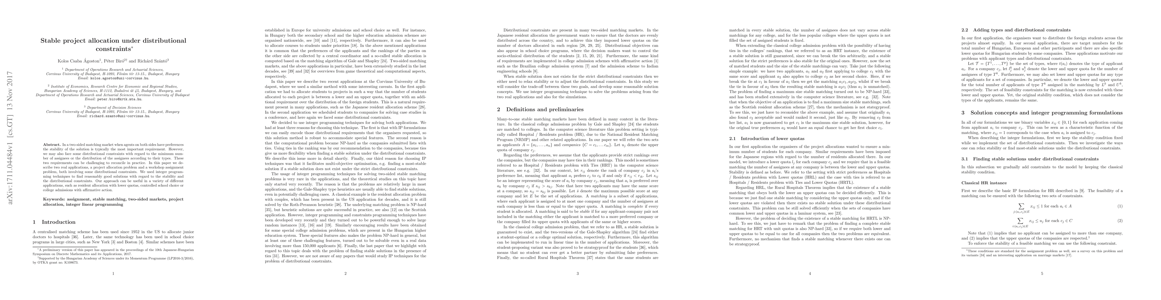 This paper explores stable project allocation under distributional constraints in two-sided matching markets, using integer programming to balance stability and constraints like minimum assignee numbers. It applies to various scenarios, including resident allocation and affirmative action in college admissions.
