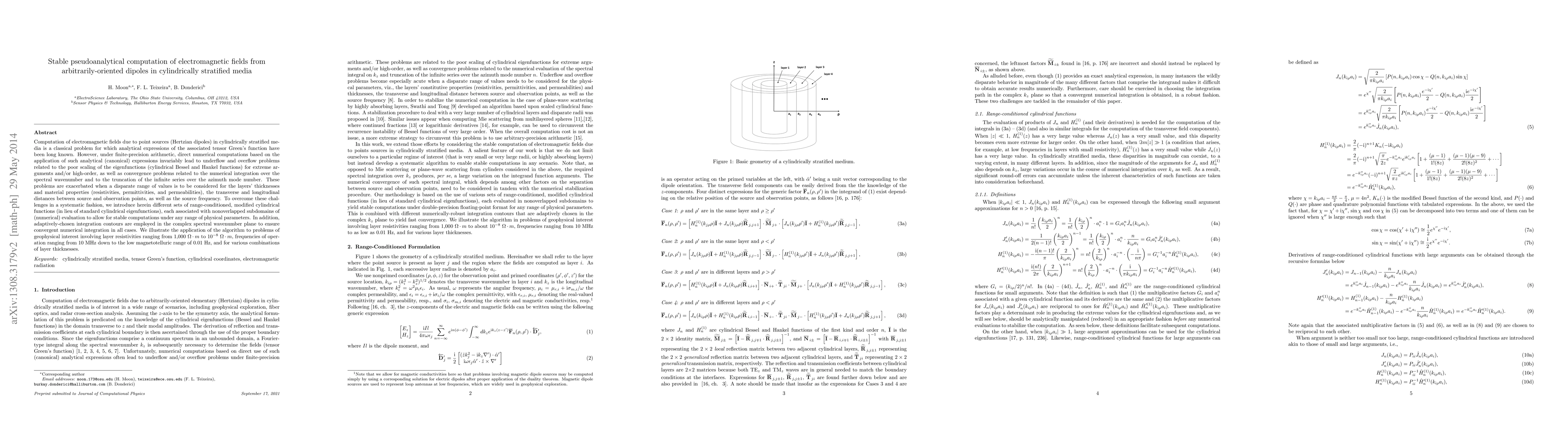 This paper presents a stable pseudoanalytical method for computing electromagnetic fields from arbitrarily-oriented dipoles in cylindrically stratified media. It addresses numerical challenges like underflow, overflow, and convergence issues by using modified cylindrical functions and adaptive integration contours, enabling accurate computations across a wide range of physical parameters.