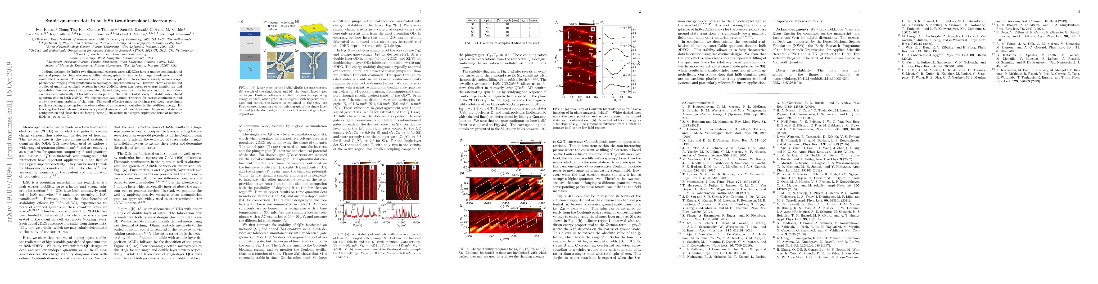 This paper investigates stable quantum dots in InSb two-dimensional electron gases (2DEGs) by removing the $\delta$-doping layer, enabling detailed studies of gate-defined quantum dots. The research reveals an even-odd variation in addition energy and a singlet-triplet spin transition at low magnetic fields due to the material's large g-factor.