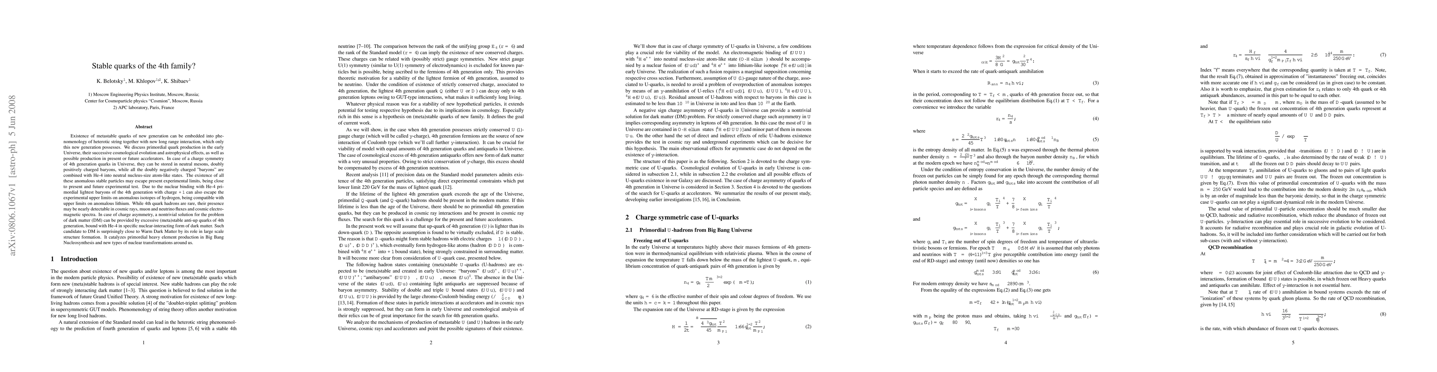 Existence of metastable quarks of new generation can be embedded into phenomenology of heterotic string together with new long range interaction, which only this new generation possesses. We discuss primordial quark production in the early Universe, their successive cosmological evolution and astrophysical effects, as well as possible production in present or future accelerators. In case of a charge symmetry of 4th generation quarks in Universe, they can be stored in neutral mesons, doubly positively charged baryons, while all the doubly negatively charged "baryons" are combined with He-4 into neutral nucleus-size atom-like states. The existence of all these anomalous stable particles may escape present experimental limits, being close to present and future experimental test. Due to the nuclear binding with He-4 primordial lightest baryons of the 4th generation with charge +1 can also escape the experimental upper limits on anomalous isotopes of hydrogen, being compatible with upper limits on anomalous lithium. While 4th quark hadrons are rare, their presence may be nearly detectable in cosmic rays, muon and neutrino fluxes and cosmic electromagnetic spectra. In case of charge asymmetry, a nontrivial solution for the problem of dark matter (DM) can be provided by excessive (meta)stable anti-up quarks of 4th generation, bound with He-4 in specific nuclear-interacting form of dark matter. Such candidate to DM is surprisingly close to Warm Dark Matter by its role in large scale structure formation. It catalyzes primordial heavy element production in Big Bang Nucleosynthesis and new types of nuclear transformations around us.