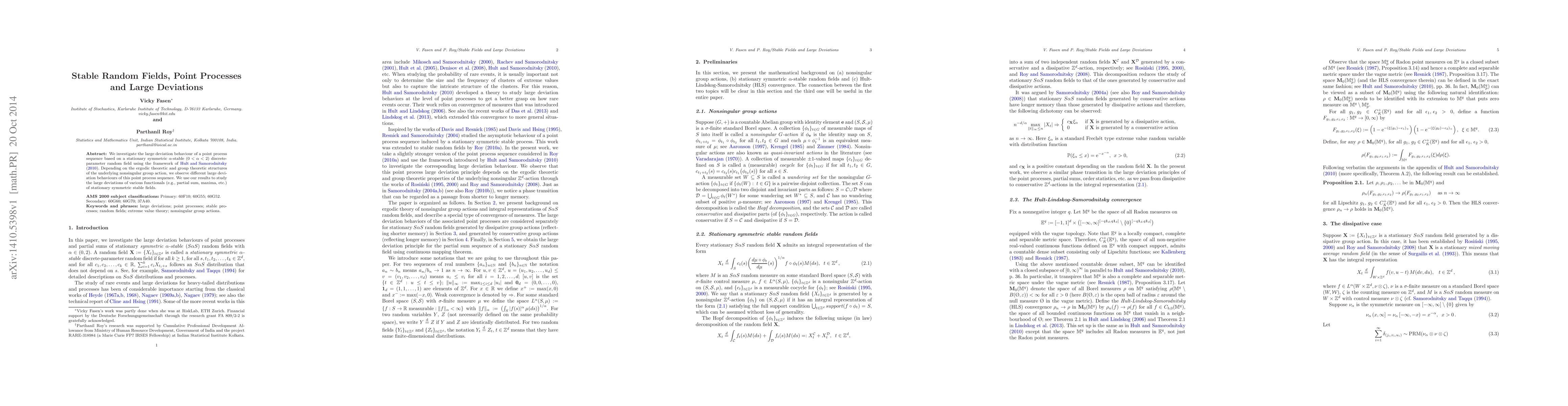 This paper examines the large deviation behavior of a point process sequence derived from a stationary symmetric stable non-Gaussian random field, revealing distinct behaviors based on the ergodic and group theoretic structures of the underlying nonsingular group action. The findings are applied to study the large deviations of various functionals of these stable fields.