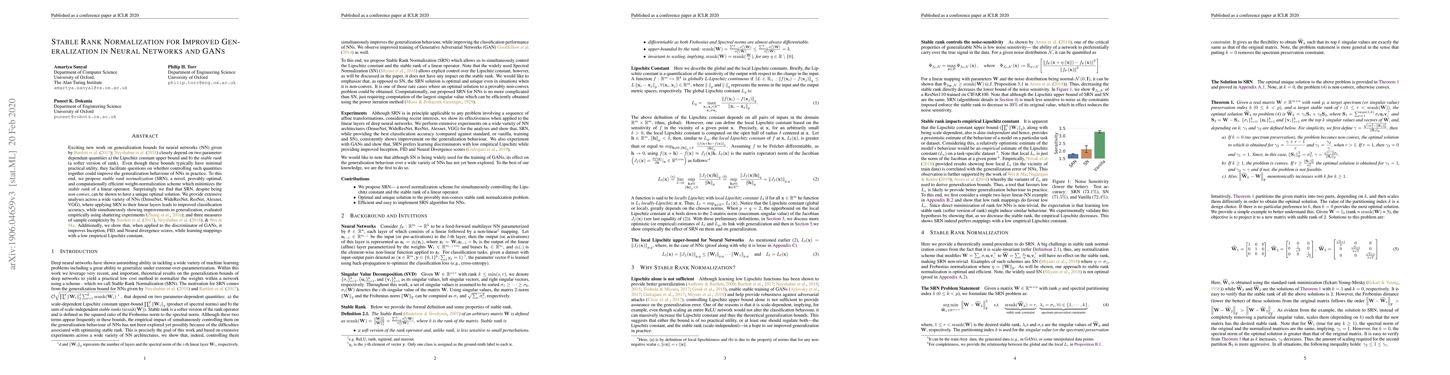 This paper proposes stable rank normalization (SRN) to improve the generalization of neural networks and GANs by minimizing the stable rank of a linear operator, which controls the empirical Lipschitz constant. SRN shows a unique optimal solution and significantly improves generalization performance by reducing memorization.