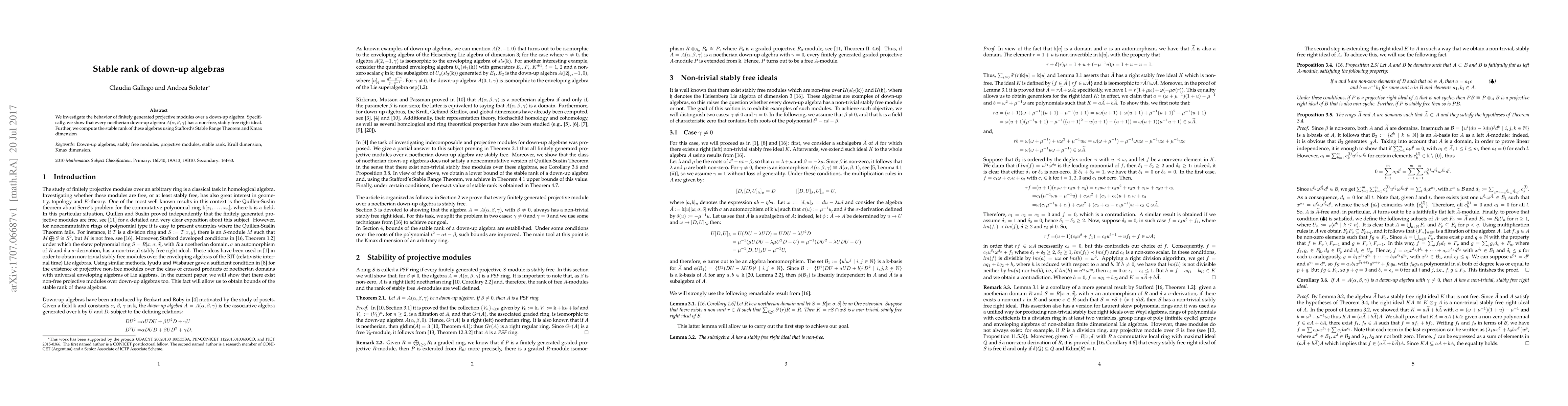 This paper examines finitely generated projective modules over down-up algebras, demonstrating that noetherian down-up algebras possess non-free, stably free right ideals. The stable rank of these algebras is computed using Stafford's Stable Range Theorem and K-theoretic methods.