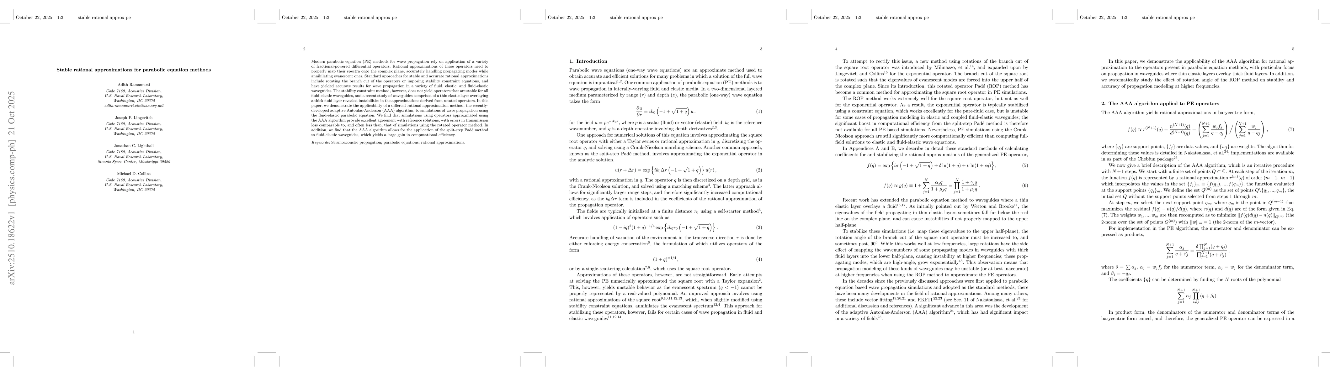 The development of a stable and accurate rational approximation method for parabolic equations using the AAA algorithm, combined with rotated operators to handle branch cuts in complex media.