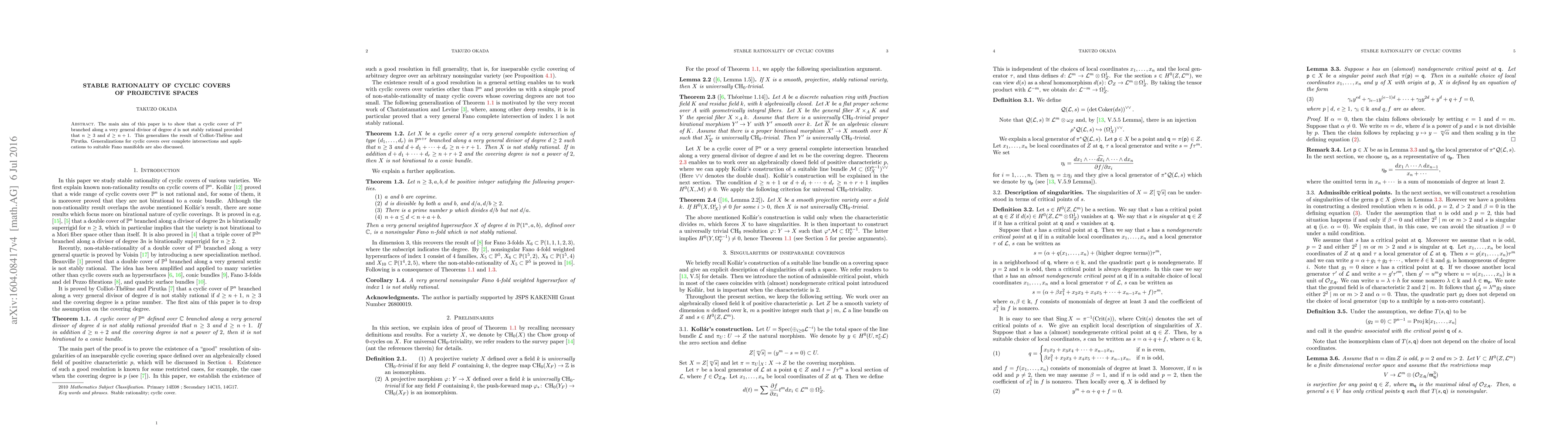Researchers prove that a specific type of mathematical object, called a cyclic cover of projective space, is not stably rational for certain conditions. They generalize this result to higher dimensions and discuss potential applications to Fano manifolds.