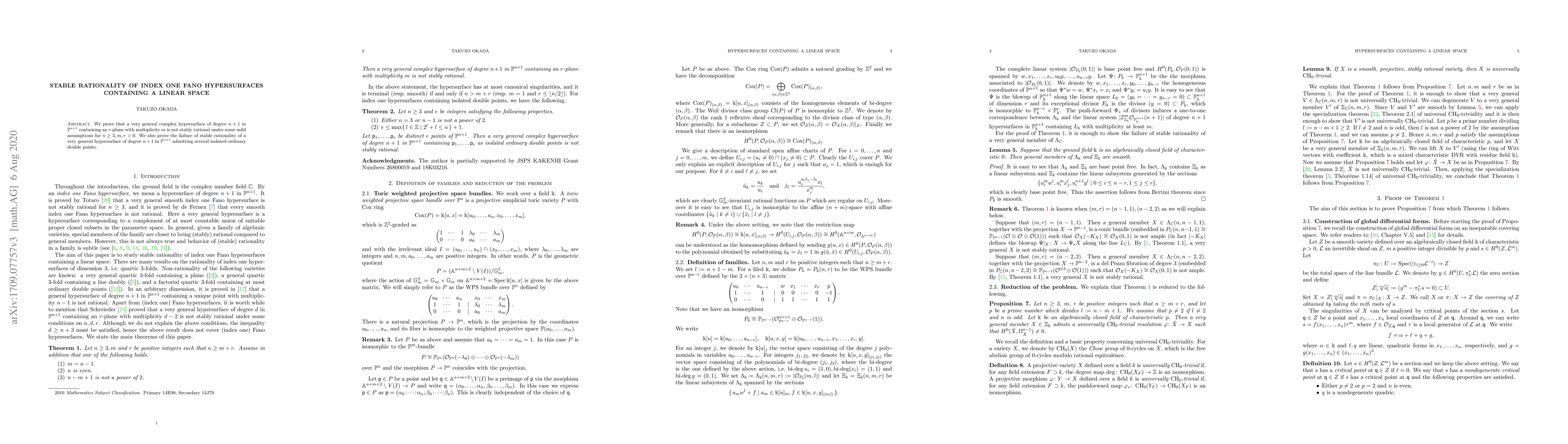 We prove that a very general complex hypersurface of degree $n+1$ in $\mathbb{P}^{n+1}$ containing an $r$-plane with multiplicity $m$ is not stably rational for $n \ge 3$, $m, r > 0$ and $n \ge m+r$. We also investigate failure of stable rationality of a very general hypersurface of degree $n+1$ in $\mathbb{P}^{n+1}$ admitting several isolated ordinary double points.