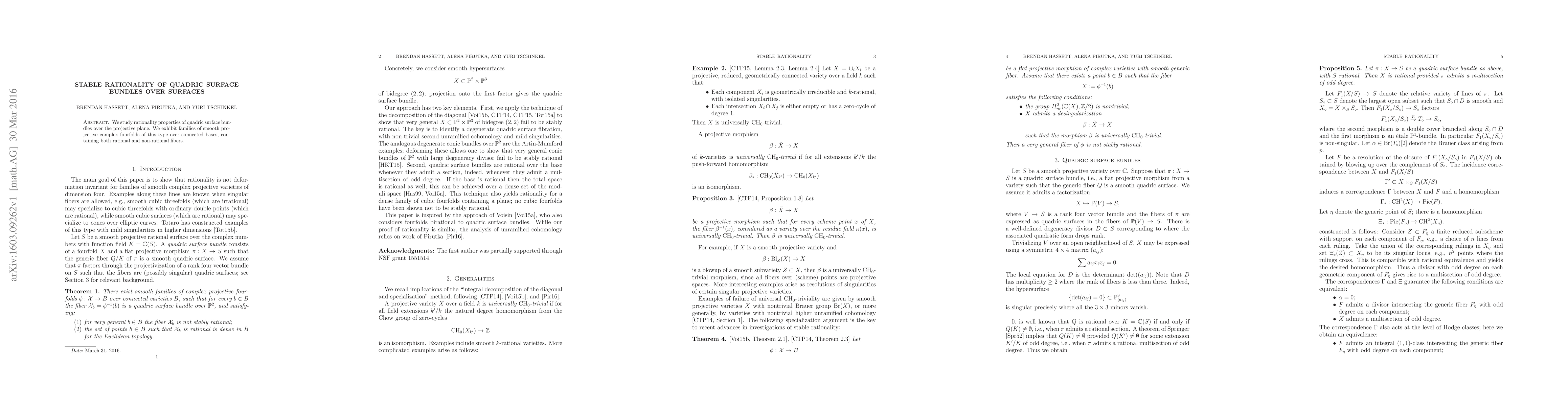 The paper investigates the rationality properties of quadric surface bundles over the projective plane, demonstrating families of smooth projective fourfolds with both rational and non-rational fibers. It highlights the stable rationality of such bundles.