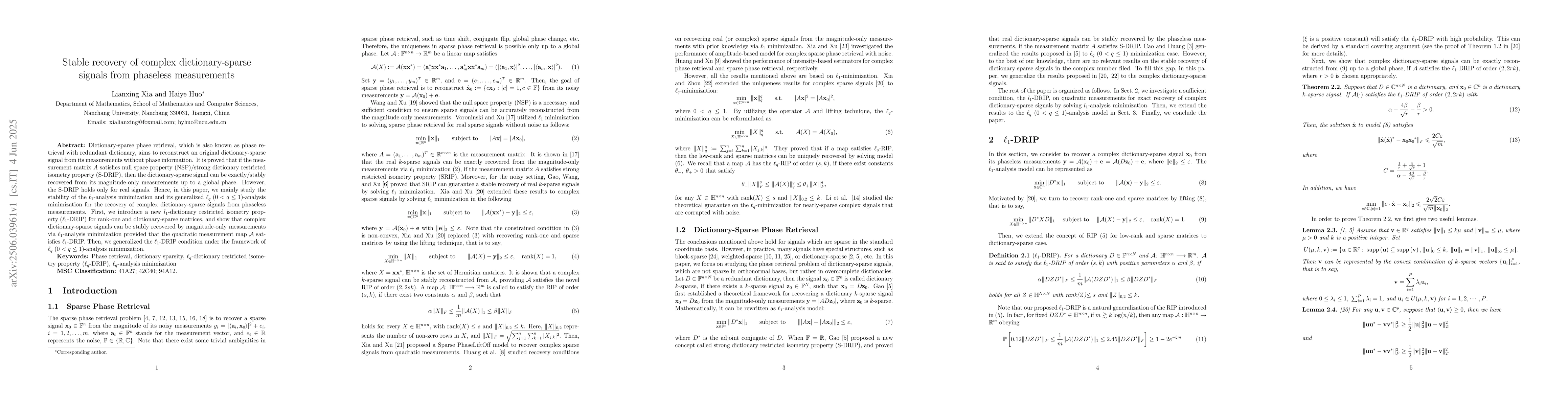 The introduction of the $\ell_1$-dictionary restricted isometry property ($\ell_1$-DRIP) for complex dictionary-sparse signals and its generalization to $\ell_q\;(0<q\leq1)$-analysis minimization.