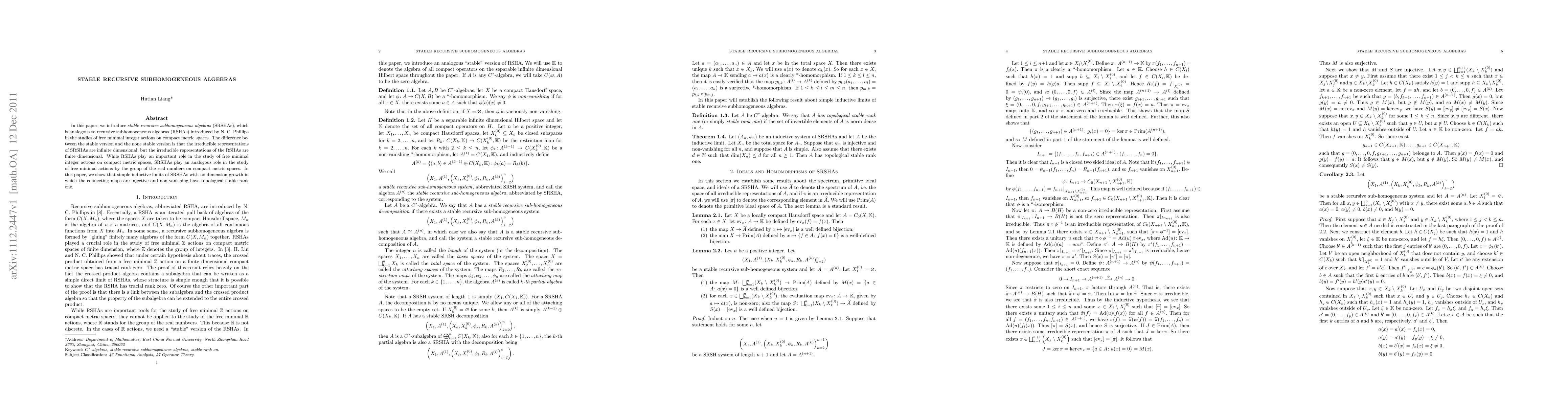 This paper introduces stable recursive subhomogeneous algebras (SRSHAs), which have infinite-dimensional irreducible representations and play a role in studying free minimal actions by the real numbers on compact metric spaces. It demonstrates that simple inductive limits of SRSHAs with injective and non-vanishing connecting maps have topological stable rank one.