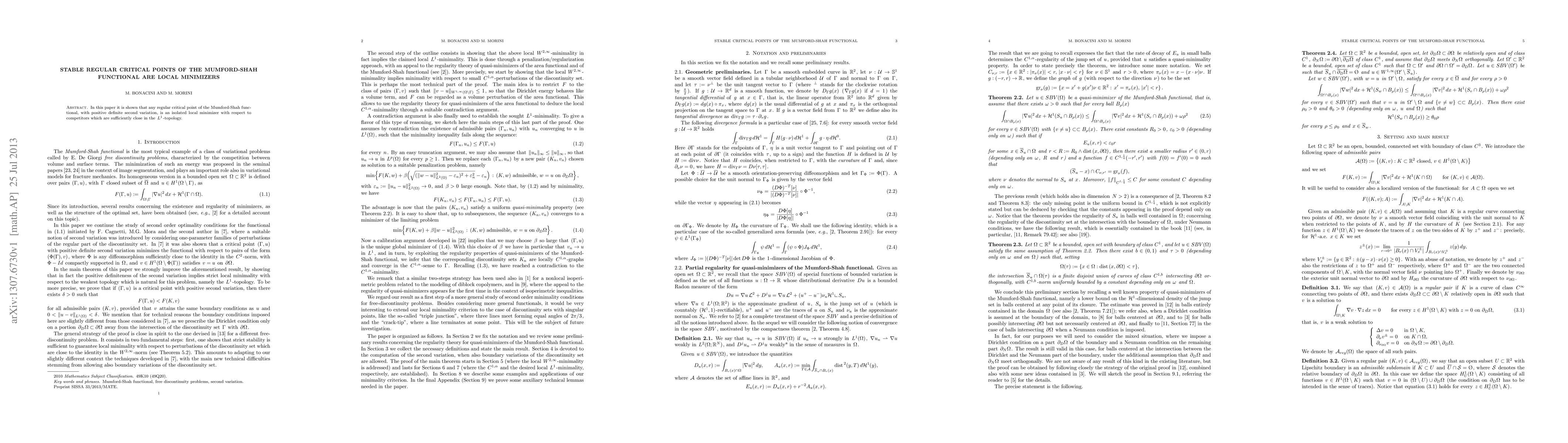 Summary: This paper demonstrates that regular critical points of the Mumford-Shah functional, possessing positive definite second variation, are isolated local minimizers when compared to competitors within a certain L^1-topology proximity. This establishes a stability property for these critical points.