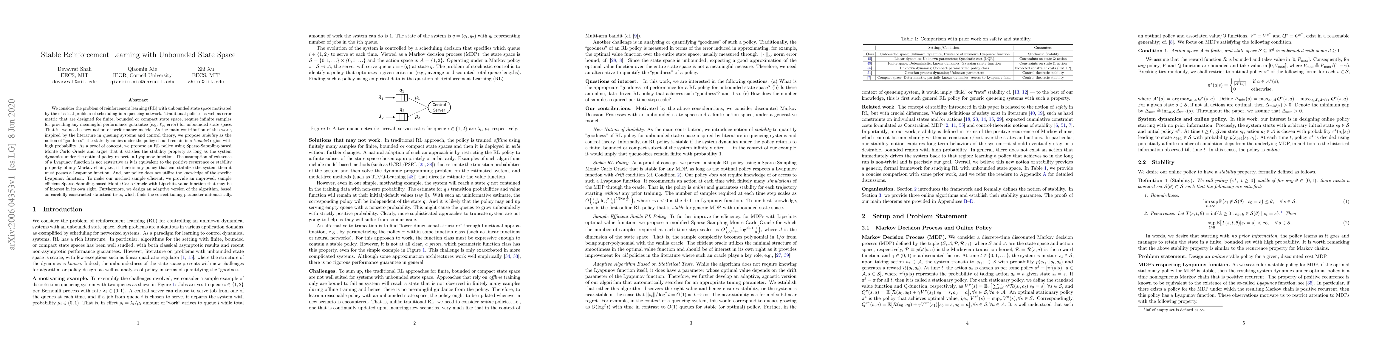 We consider the problem of reinforcement learning (RL) with unbounded state space motivated by the classical problem of scheduling in a queueing network. Traditional policies as well as error metric that are designed for finite, bounded or compact state space, require infinite samples for providing any meaningful performance guarantee (e.g. $\ell_\infty$ error) for unbounded state space. That is, we need a new notion of performance metric. As the main contribution of this work, inspired by the literature in queuing systems and control theory, we propose stability as the notion of "goodness": the state dynamics under the policy should remain in a bounded region with high probability. As a proof of concept, we propose an RL policy using Sparse-Sampling-based Monte Carlo Oracle and argue that it satisfies the stability property as long as the system dynamics under the optimal policy respects a Lyapunov function. The assumption of existence of a Lyapunov function is not restrictive as it is equivalent to the positive recurrence or stability property of any Markov chain, i.e., if there is any policy that can stabilize the system then it must possess a Lyapunov function. And, our policy does not utilize the knowledge of the specific Lyapunov function. To make our method sample efficient, we provide an improved, sample efficient Sparse-Sampling-based Monte Carlo Oracle with Lipschitz value function that may be of interest in its own right. Furthermore, we design an adaptive version of the algorithm, based on carefully constructed statistical tests, which finds the correct tuning parameter automatically.