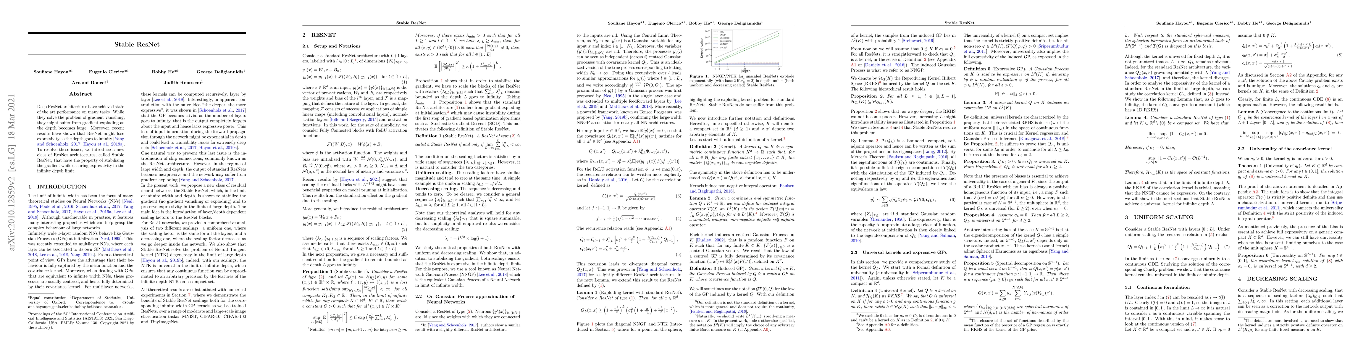 Deep ResNet architectures have achieved state of the art performance on many tasks. While they solve the problem of gradient vanishing, they might suffer from gradient exploding as the depth becomes large (Yang et al. 2017). Moreover, recent results have shown that ResNet might lose expressivity as the depth goes to infinity (Yang et al. 2017, Hayou et al. 2019). To resolve these issues, we introduce a new class of ResNet architectures, called Stable ResNet, that have the property of stabilizing the gradient while ensuring expressivity in the infinite depth limit.