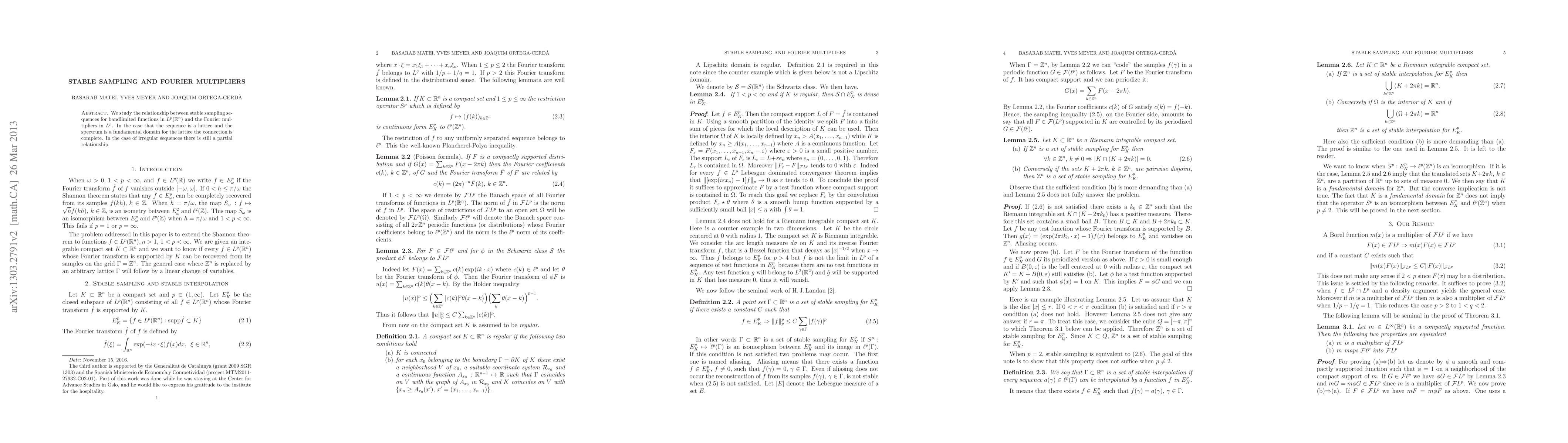 We study the relationship between stable sampling sequences for bandlimited functions in $L^p(\R^n)$ and the Fourier multipliers in $L^p$. In the case that the sequence is a lattice and the spectrum is a fundamental domain for the lattice the connection is complete. In the case of irregular sequences there is still a partial relationship.