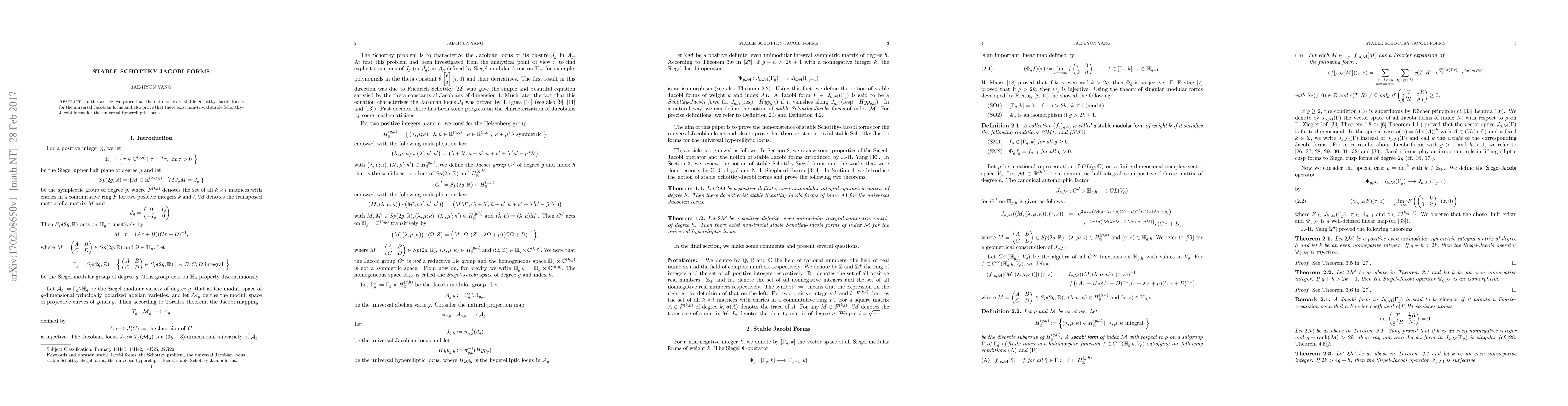 This paper demonstrates the non-existence of stable Schottky-Jacobi forms for the universal Jacobian locus while proving the existence of non-trivial stable Schottky-Jacobi forms for the universal hyperelliptic locus.