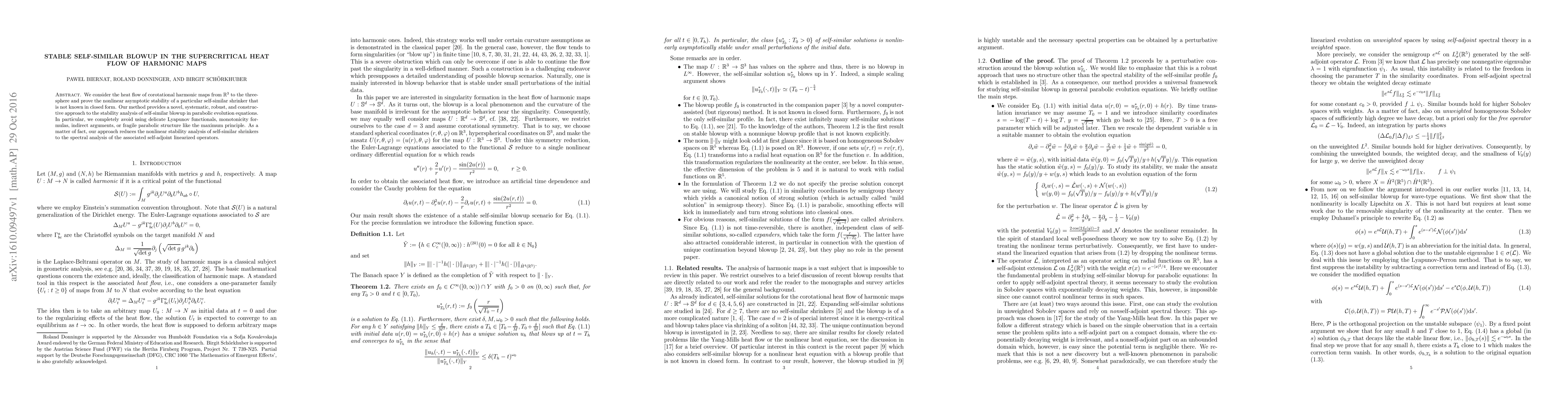 We consider the heat flow of corotational harmonic maps from $\mathbb R^3$ to the three-sphere and prove the nonlinear asymptotic stability of a particular self-similar shrinker that is not known in closed form. Our method provides a novel, systematic, robust, and constructive approach to the stability analysis of self-similar blowup in parabolic evolution equations. In particular, we completely avoid using delicate Lyapunov functionals, monotonicity formulas, indirect arguments, or fragile parabolic structure like the maximum principle. As a matter of fact, our approach reduces the nonlinear stability analysis of self-similar shrinkers to the spectral analysis of the associated self-adjoint linearized operators.