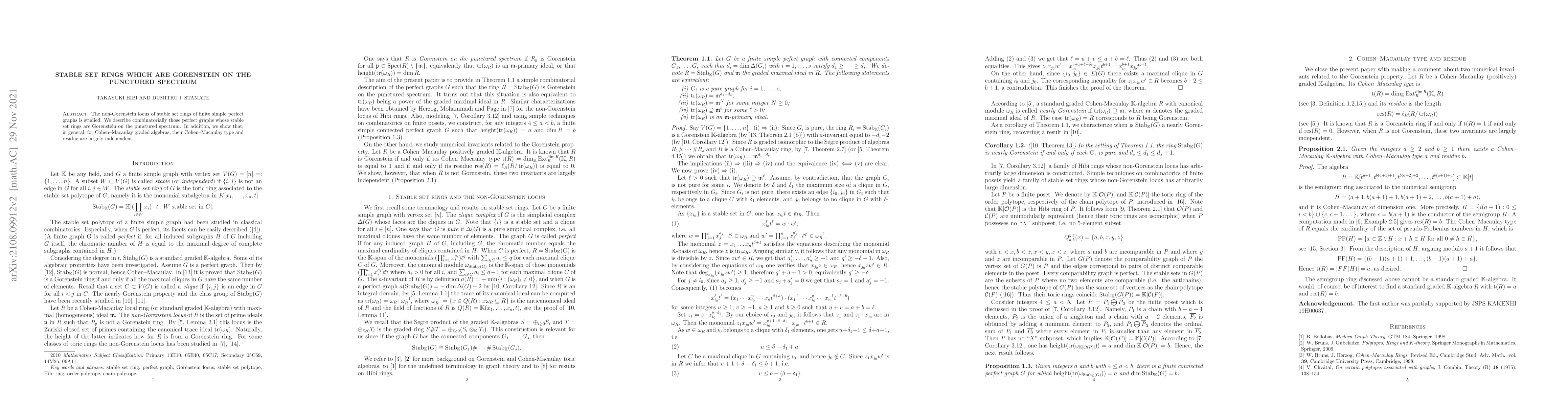 This paper investigates the non-Gorenstein locus of stable set rings in finite simple perfect graphs, identifying those graphs whose stable set rings are Gorenstein on the punctured spectrum. It also demonstrates that, for Cohen-Macaulay graded algebras, their Cohen-Macaulay type and residue are generally independent.