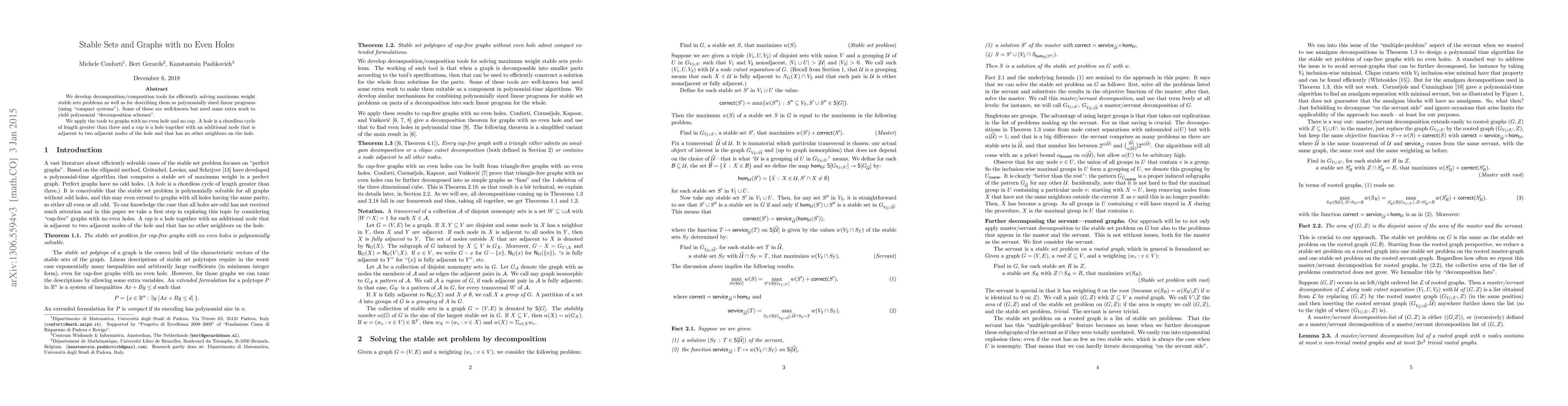 We develop decomposition/composition tools for efficiently solving maximum weight stable sets problems as well as for describing them as polynomially sized linear programs (using "compact systems"). Some of these are well-known but need some extra work to yield polynomial "decomposition schemes". We apply the tools to graphs with no even hole and no cap. A hole is a chordless cycle of length greater than three and a cap is a hole together with an additional node that is adjacent to two adjacent nodes of the hole and that has no other neighbors on the hole.