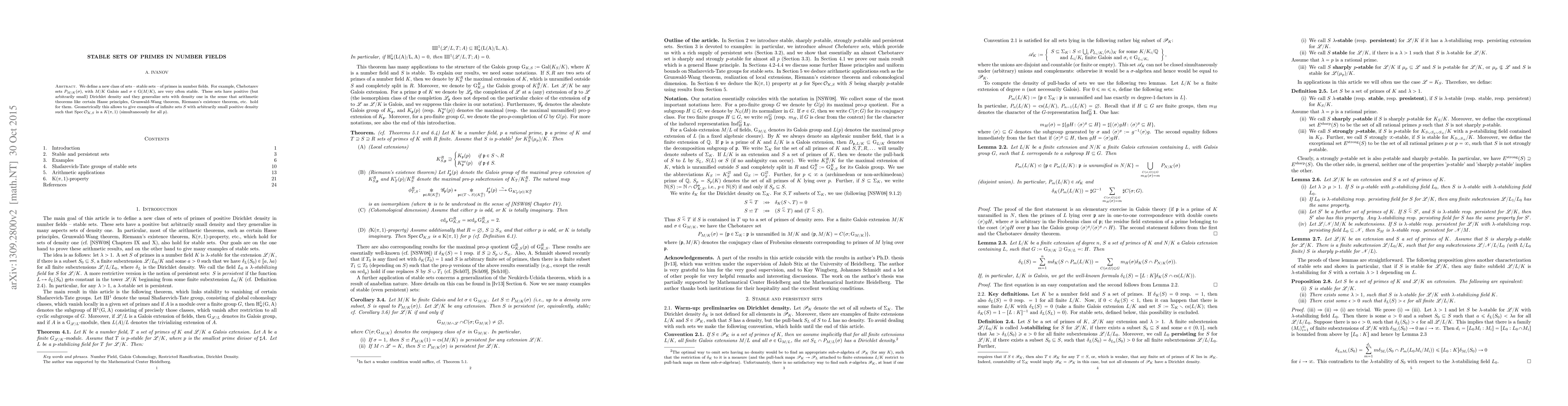 We define a new class of sets -- stable sets -- of primes in number fields. For example, Chebotarev sets $P_{M/K}(\sigma)$, with $M/K$ Galois and $\sigma \in \Gal(M/K)$, are very often stable. These sets have positive (but arbitrary small) Dirichlet density and generalize sets with density 1 in the sense that arithmetic theorems like certain Hasse principles, the Grunwald-Wang theorem, the Riemann's existence theorem, etc. hold for them. Geometrically this allows to give examples of infinite sets $S$ with arbitrary small positive density such that $\Spec \mathcal{O}_{K,S}$ is algebraic $K(\pi,1)$ (for all $p$ simultaneous).