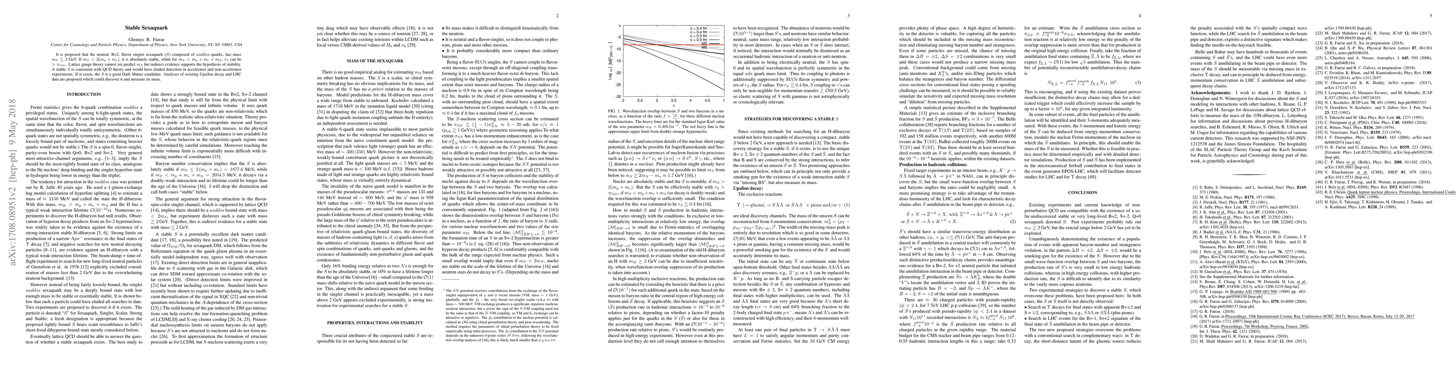 It is proposed that the neutral, B=2, flavor singlet sexaquark (S) composed of uuddss quarks, has mass m_S <~ 2 GeV. If m_S < 2 (m_p + m_e), it is absolutely stable, while for m_S < m_p+m_e + m_Lambda, its lifetime can be greater than the age of the Universe. Lattice gauge theory cannot yet predict m_S, but indirect evidence supports the hypothesis of stability. A stable S is consistent with QCD theory and would have eluded detection in accelerator and non-accelerator experiments. If it exists, the S is a good Dark Matter candidate. Analyses of existing Upsilon decay and LHC data can be used to discover it and measure its mass.