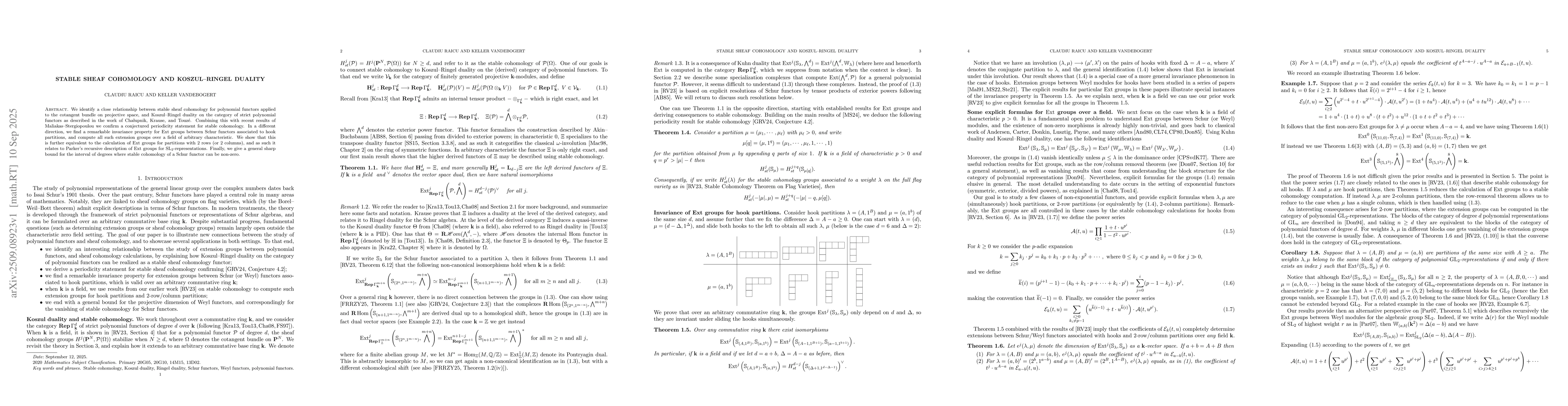 We identify a close relationship between stable sheaf cohomology for polynomial functors applied to the cotangent bundle on projective space, and Koszul--Ringel duality on the category of strict polynomial functors as described in the work of Cha\l upnik, Krause, and Touz\'e. Combining this with recent results of Maliakas--Stergiopoulou we confirm a conjectured periodicity statement for stable cohomology. In a different direction, we find a remarkable invariance property for $\Ext$ groups between Schur functors associated to hook partitions, and compute all such extension groups over a field of arbitrary characteristic. We show that this is further equivalent to the calculation of $\Ext$ groups for partitions with $2$ rows (or $2$ columns), and as such it relates to Parker's recursive description of $\Ext$ groups for $\SL_2$-representations. Finally, we give a general sharp bound for the interval of degrees where stable cohomology of a Schur functor can be non-zero.