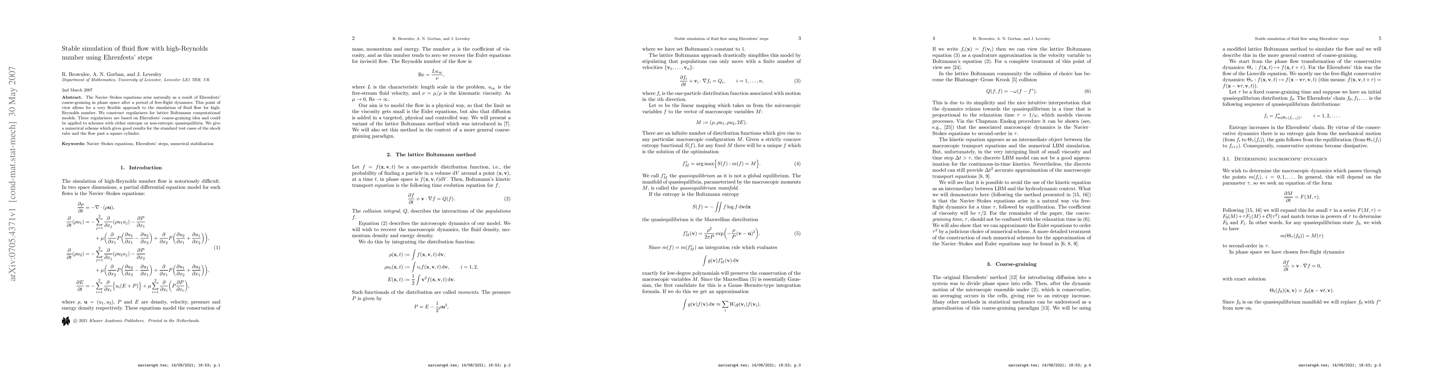 The Navier--Stokes equations arise naturally as a result of Ehrenfests' coarse-graining in phase space after a period of free-flight dynamics. This point of view allows for a very flexible approach to the simulation of fluid flow for high-Reynolds number. We construct regularisers for lattice Boltzmann computational models. These regularisers are based on Ehrenfests' coarse-graining idea and could be applied to schemes with either entropic or non-entropic quasiequilibria. We give a numerical scheme which gives good results for the standard test cases of the shock tube and the flow past a square cylinder.