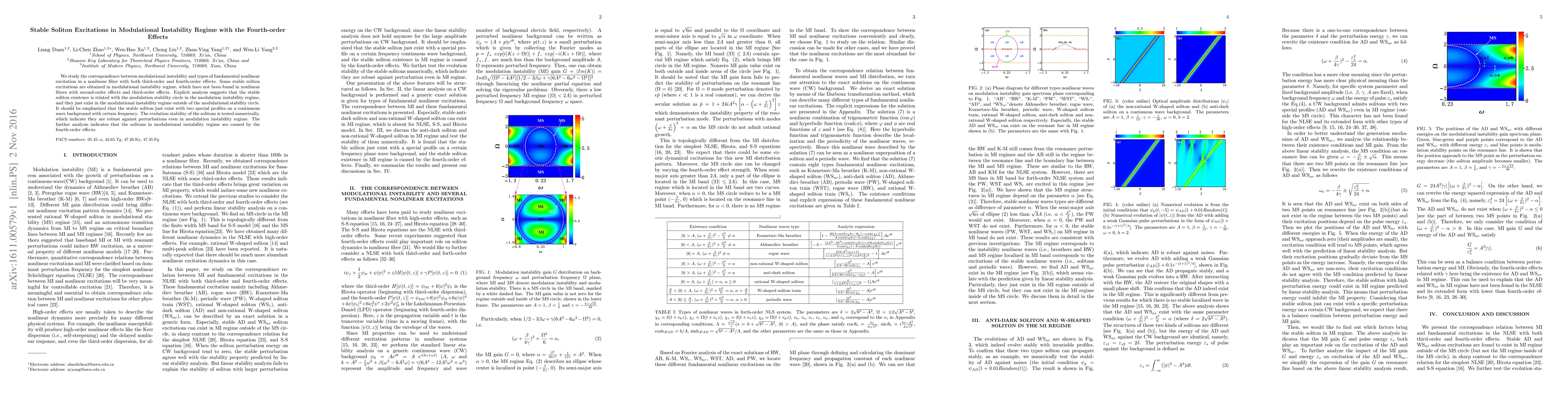 This paper investigates stable soliton excitations in nonlinear fibers experiencing modulational instability, revealing that fourth-order effects lead to unique stable solitons outside the modulation stability circle. Numerical tests show these solitons are robust against perturbations.