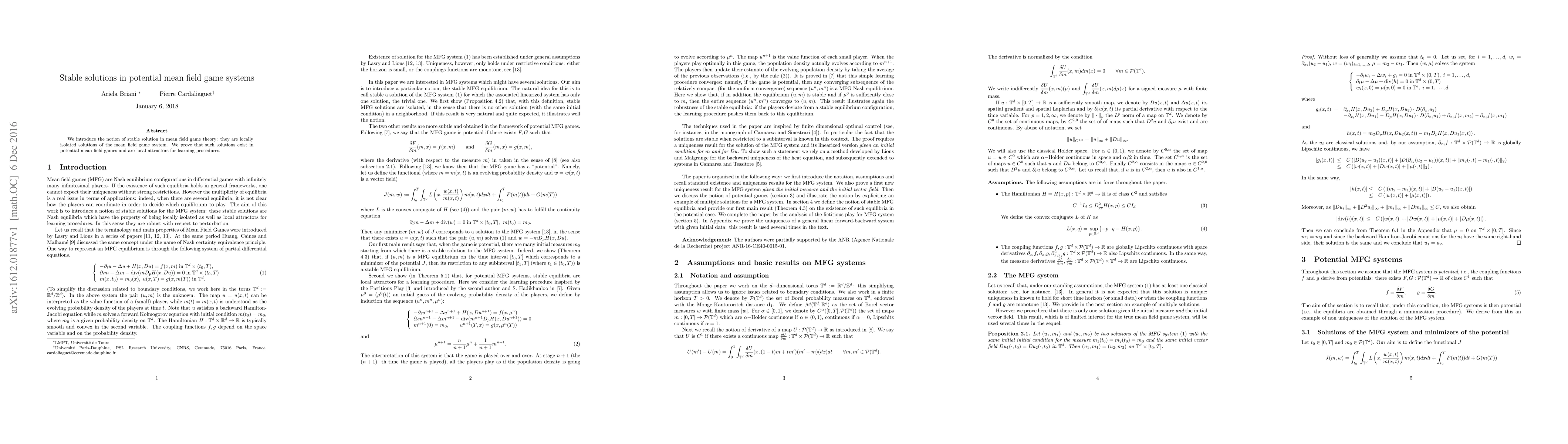 Summary: This paper introduces the concept of stable solutions in mean field game theory, demonstrating their existence in potential mean field games and their role as local attractors in learning procedures. These stable solutions are locally isolated and provide a robust framework for analysis.