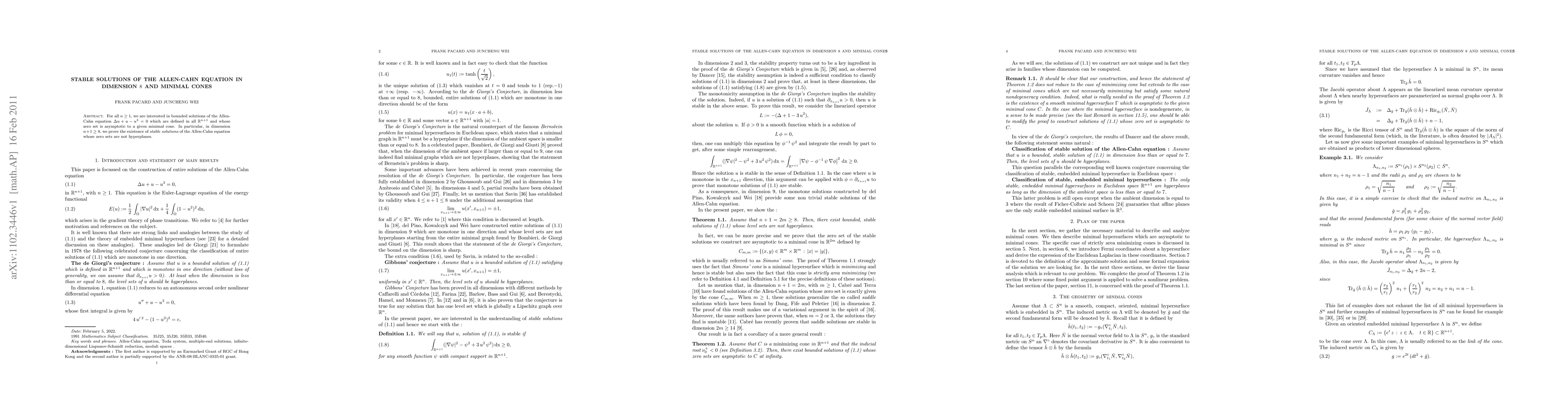This paper proves the existence of stable, bounded entire solutions to the Allen-Cahn equation in dimensions 8 and higher, where the zero sets of these solutions asymptotically approach a given minimal cone, rather than being hyperplanes.